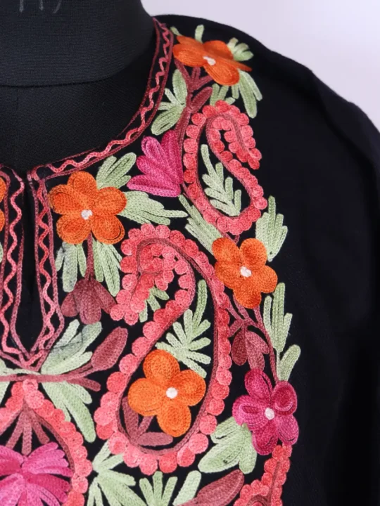 This warm  black Cashmilon wool pheran is soft and cozy for winter days. It has Aari floral embroidery across the neckline in lovely colors. It has a chest size of 52 inches and a length of 43 inches.