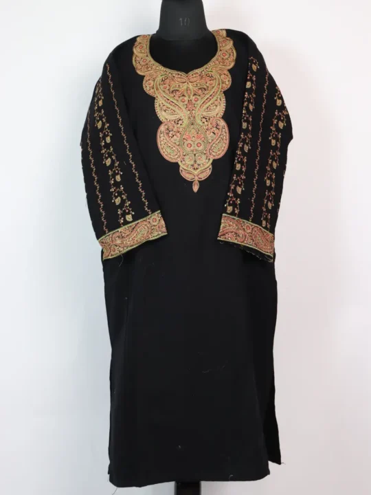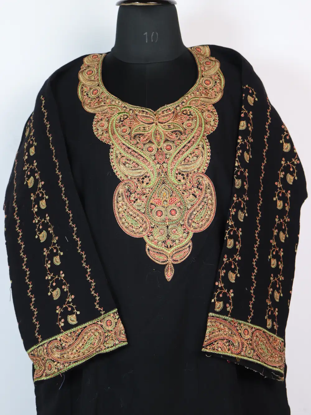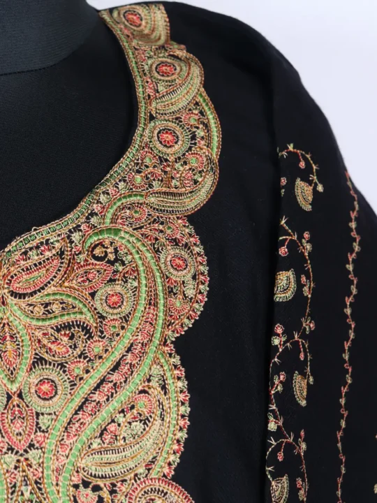 This black cashmilon wool pheran carries elegance in its soft fabric. This embroidery highlights heavy huge badam and vine patterns stitched in red and green across the sleeves and neckline. It is a garment that is cozy yet beautifully adorned, perfect for winter styling.