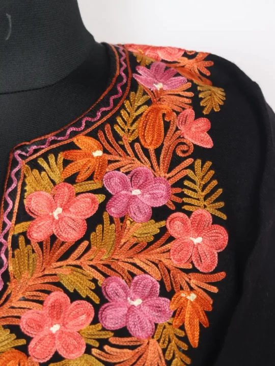 Made in Cashmilon wool, this black colour phiran dress features aari embroidery on the front back neckline, sleeves and daman corners. Its chest size 52 and length 44 inches, offers a roomy fit.