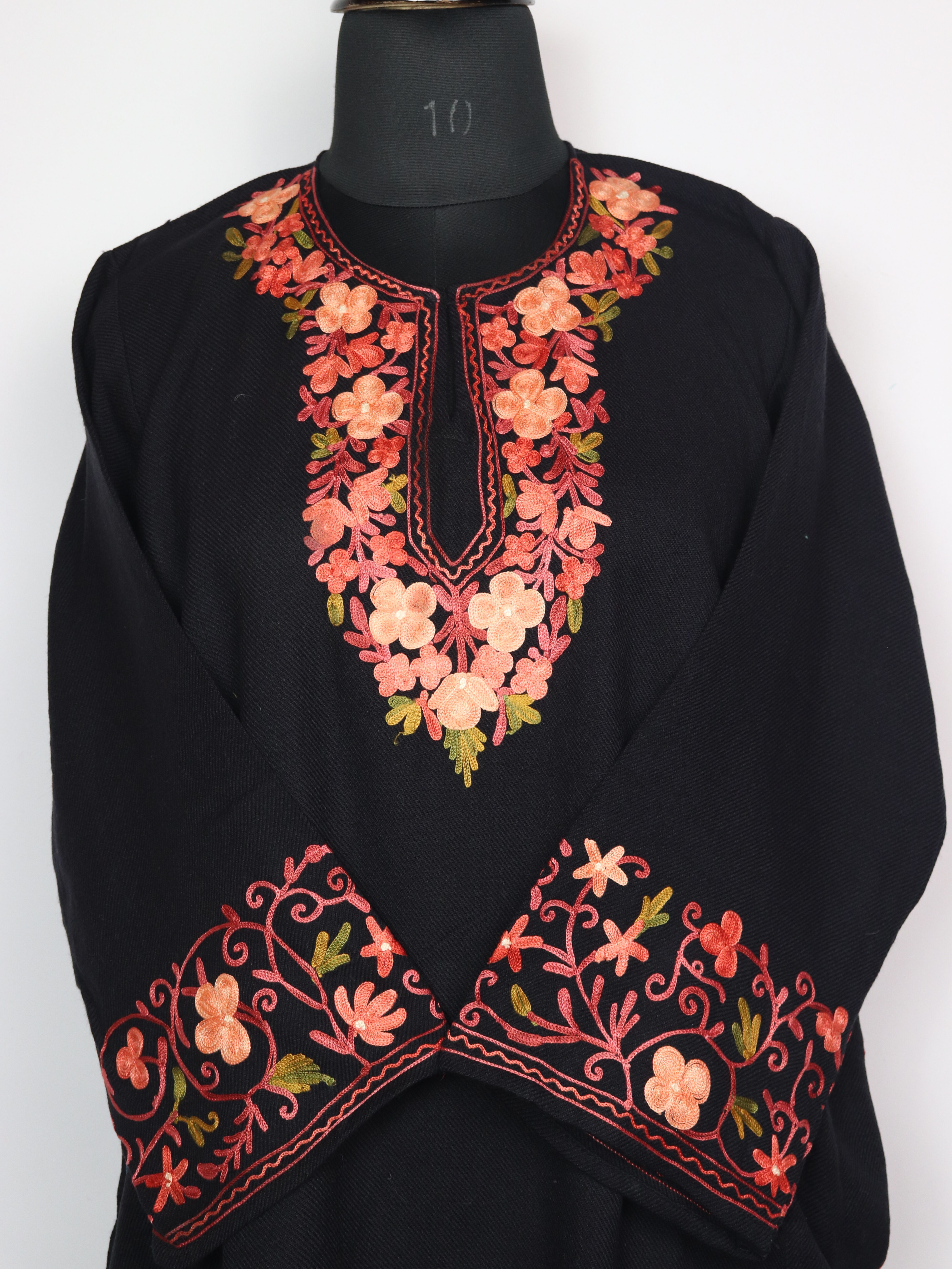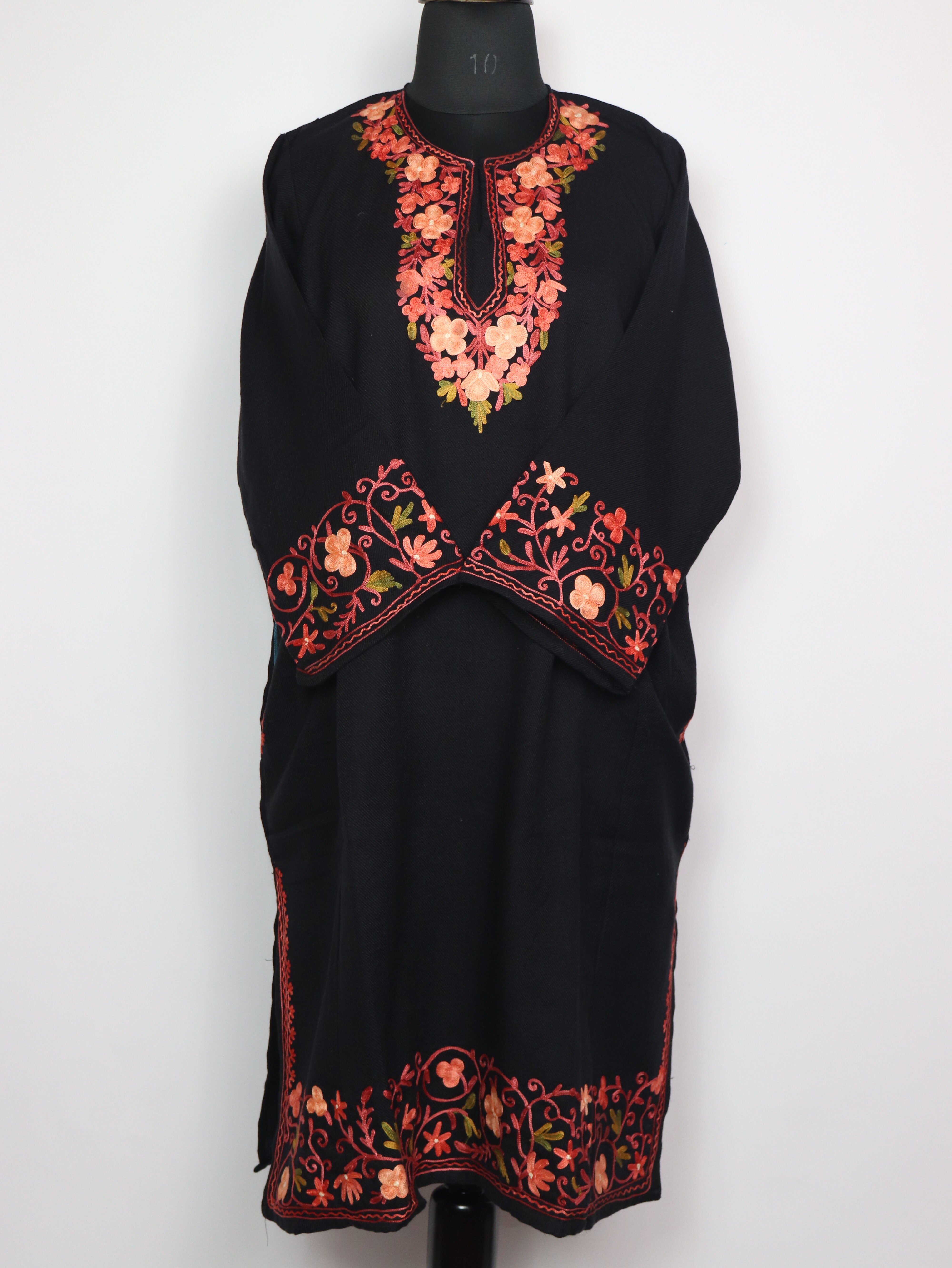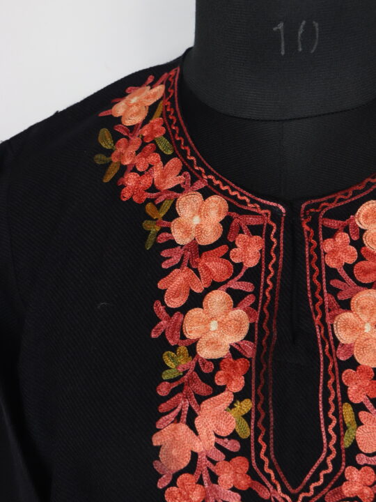 This beautiful evergreen black cashmilon wool feran keeps you warm with its soft feel and bright aari embroidery on the neckline. The floral design stands out beautifully. Chest is 52 inches and length is 42 inches, giving a roomy, easy fall. It also has pockets on both sides for daily use.