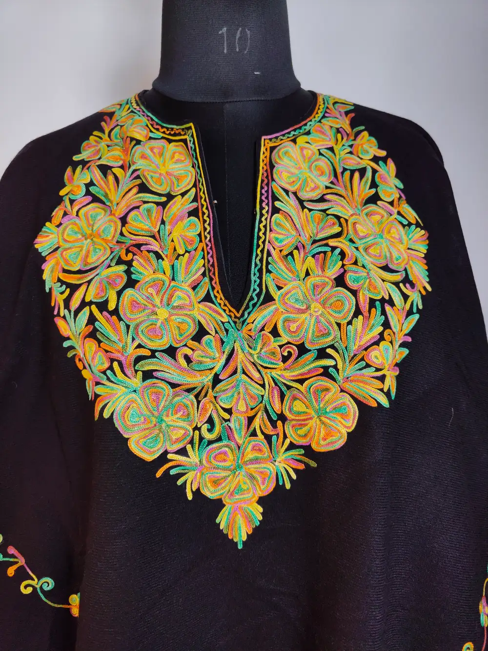 Black Cashmilon wool shapes this Kashmiri poncho with floral Aari at the neckline and continuous edge embroidery. From side-by-side its size is 64 inches and length is 31 inches. It has lining included.