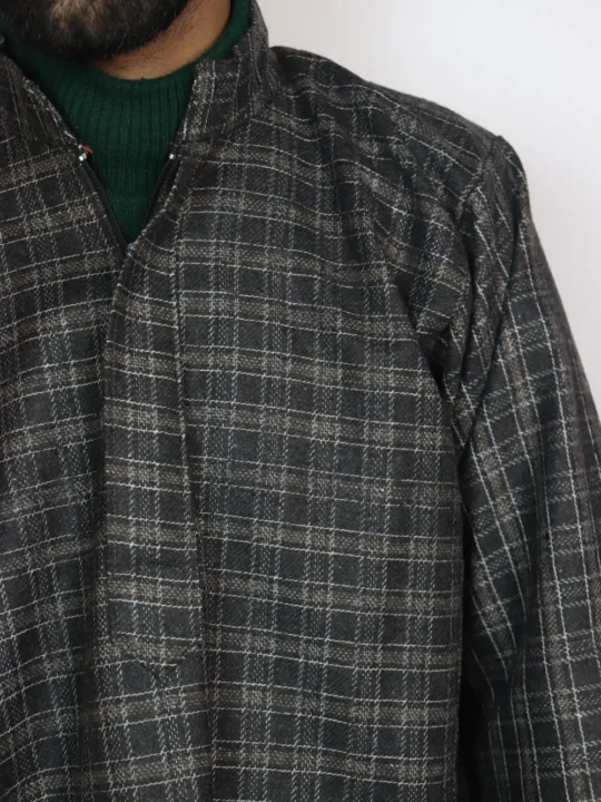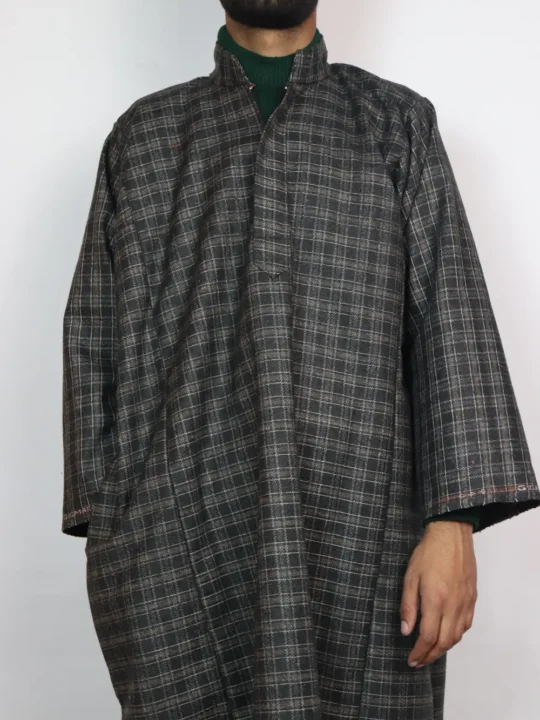Tweed wool gives this black colour pheranenhanced with check patterns, a composed fall with its chest size 62 inches and Length 48 inches and also it has pocket on the right side for practicality.