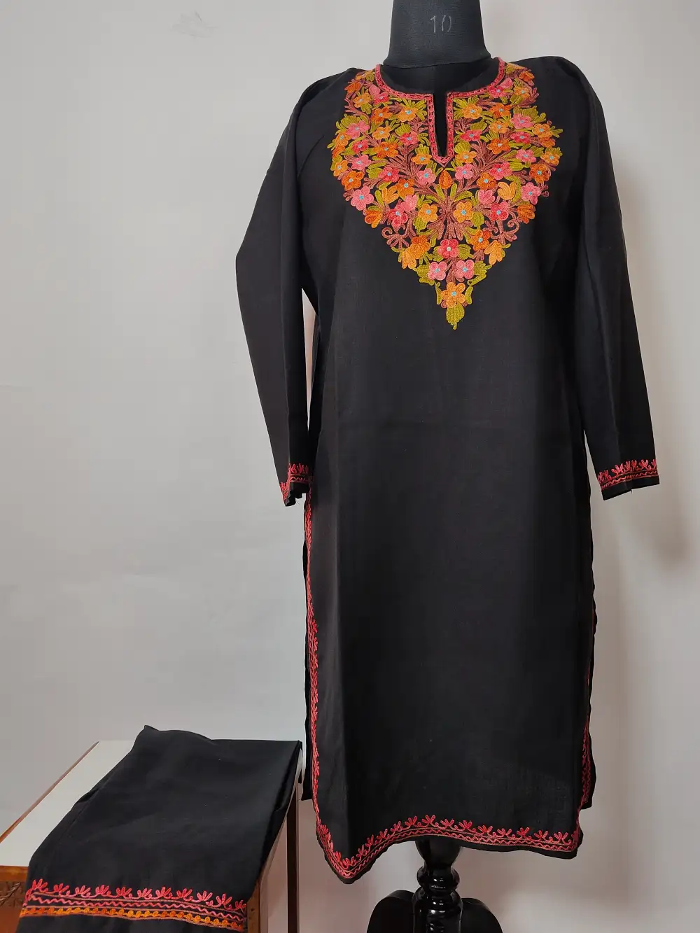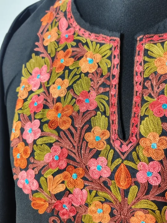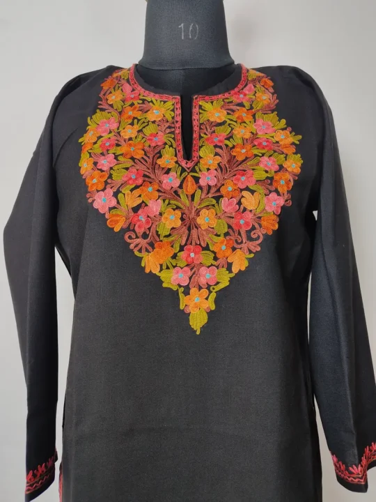 Light and stylish, this black color ruby cotton kurti set includes both the kurti and its matching bottom. The neckline stands out with red orange floral and green leafy motifs, done in Aari embroidery, bring elegance to the design. Its fabric ensures ease of wear, while the embroidery adds a soft artistic finish. Whether you wear it daily or for small gatherings, this set offers a blend of comfort and style.
