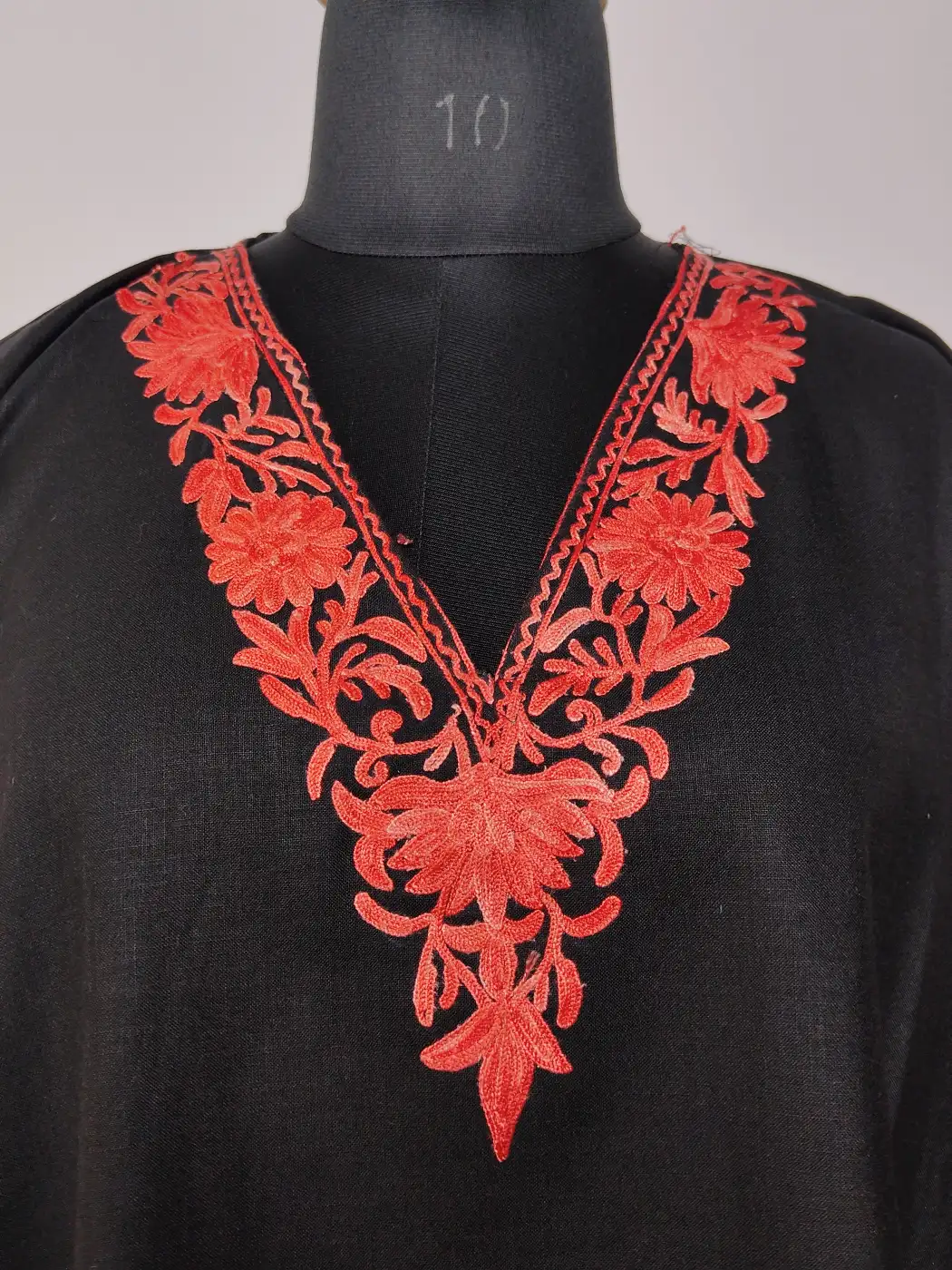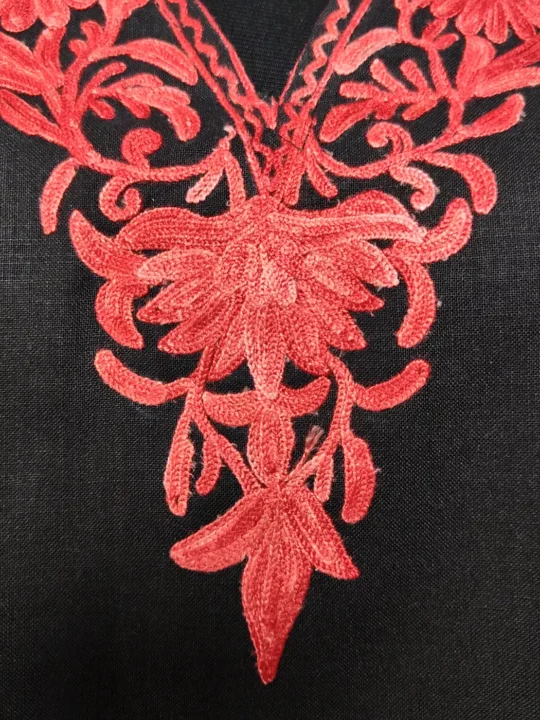 In this Kashmiri aari work kaftan set, vine embroidery gently outlines the side panels, paired with floral motifs at the neckline. Crafted from black ruby cotton, this kaftan and trouser combination offers comfort with a expression of Kashmiri craftsmanship.