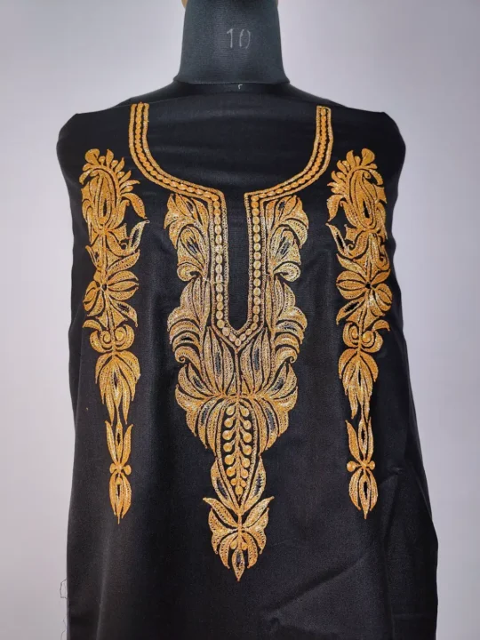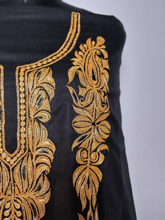 Floral botte tilla embroidery defines the neckline of this 2pc Kashmiri suit material, set against a rich black ruby cotton base. Offered as an unstitched 2pc salwar kameez, it allows you to create a look that feels comfortable, graceful, and entirely your own.