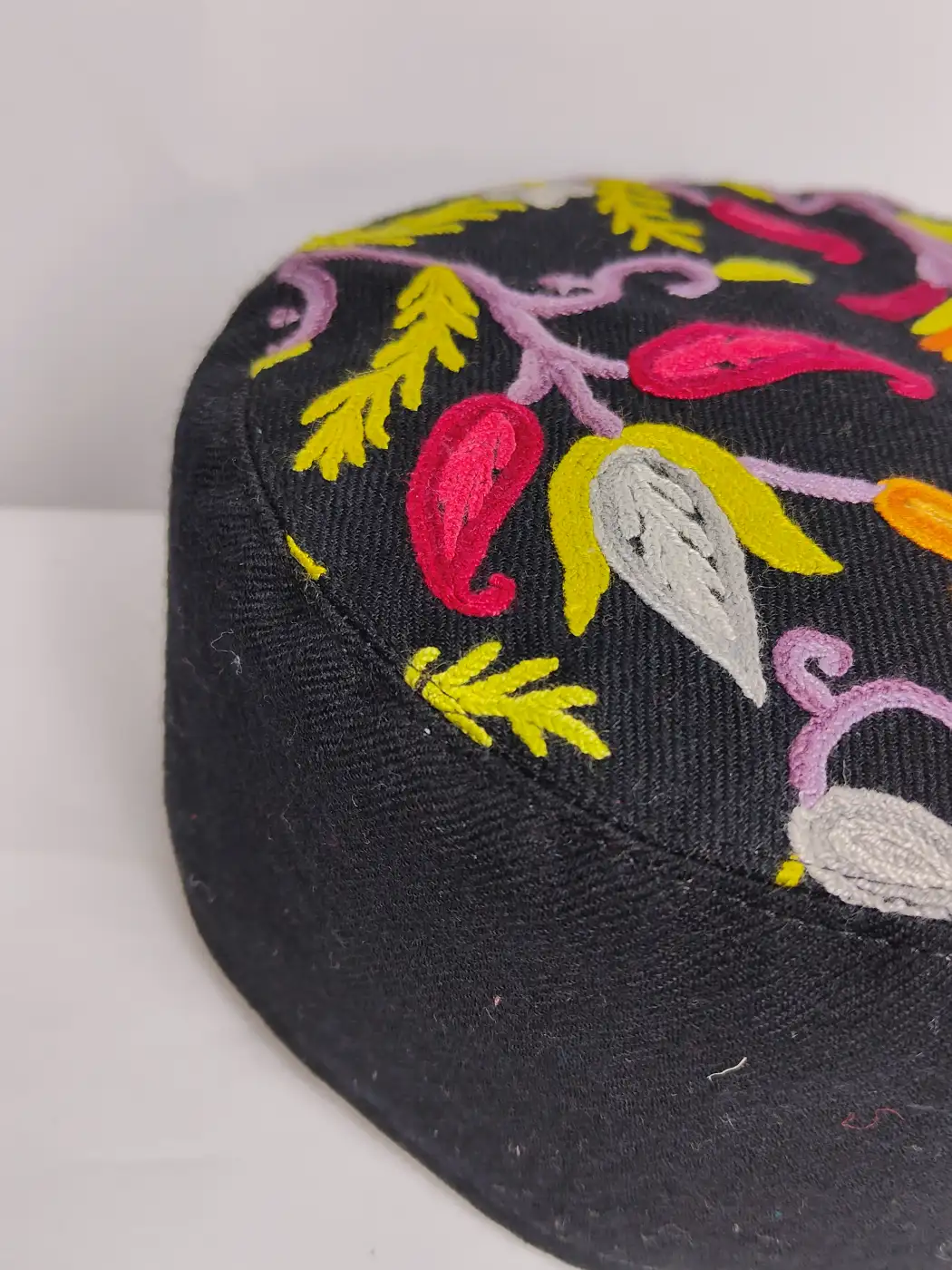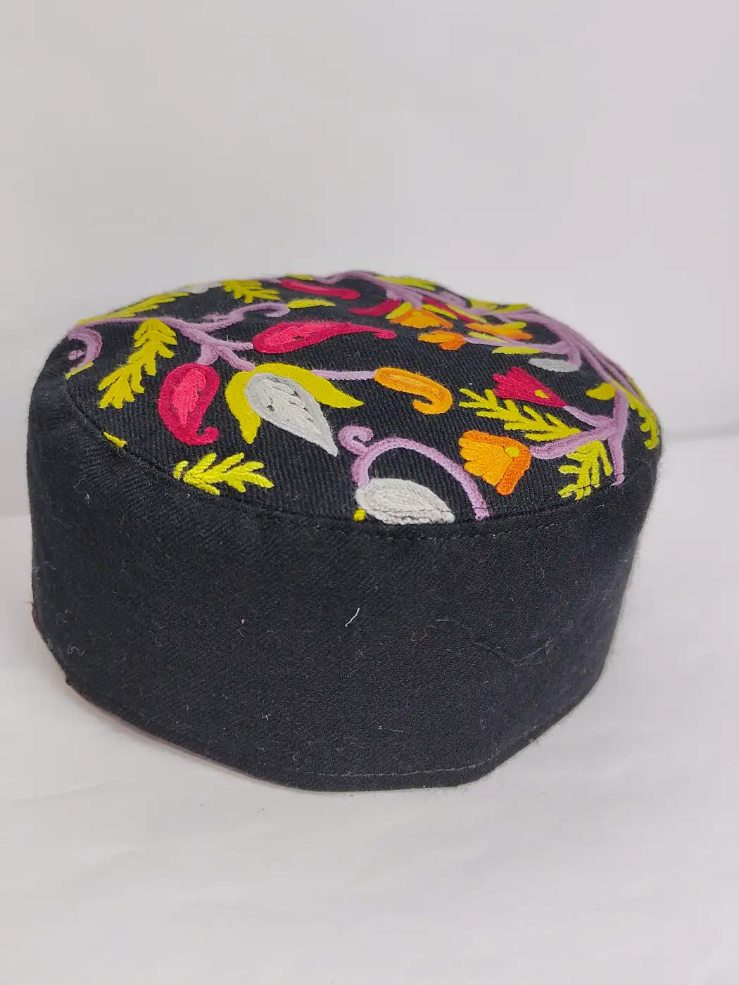 Floral embroidery decorates the crown of this Kashmiri cap which is made for gents, enriched with delicate tiny badam motifs , while sides are kept plain. This topi is crafted from black pure wool and finished with hand aari work, reflecting elegant Kashmiri craftsmanship.