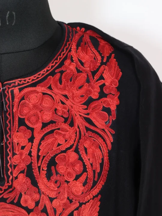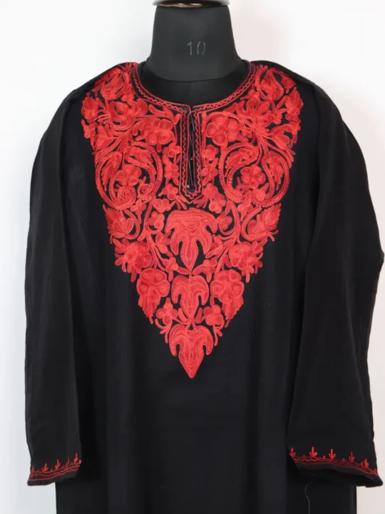 This is a refined black Cashmilon wool Pheran it is adorned with badam Aari chinar kaam at the neckline. Sized 49 chest size and 42 length with two side pockets, the Pheran offers visible chinar motifs.