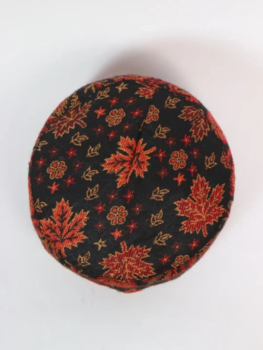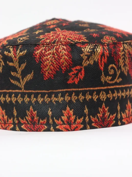 This black traditional kani cap sized 21 inches and available at 1149 rs offers classic chinar patterns and a purposeful fit. This kani cap has a calm Kashmiri presence and suits both formal prayer settings and everyday headwear needs.