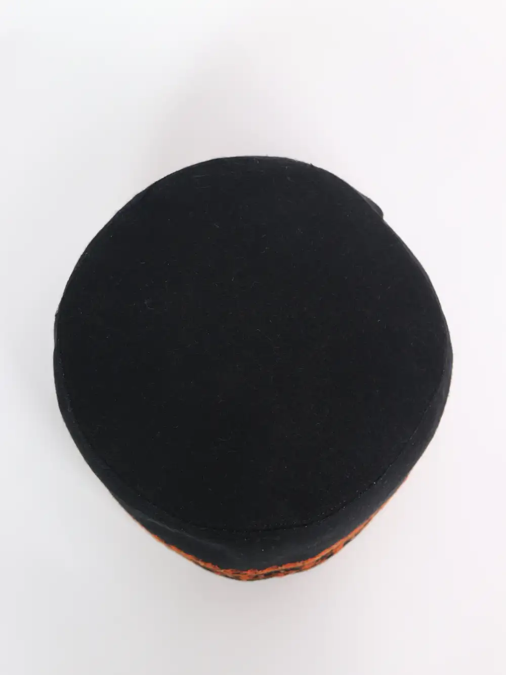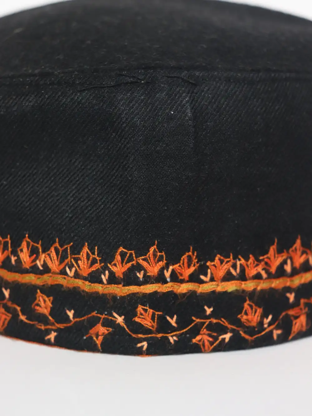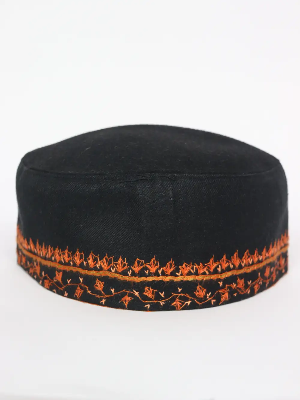 Toosha fabric creates the soft foundation of this black colour cap, it has been accented with Aari embroidery arranged as a simple border in continuous patterns.