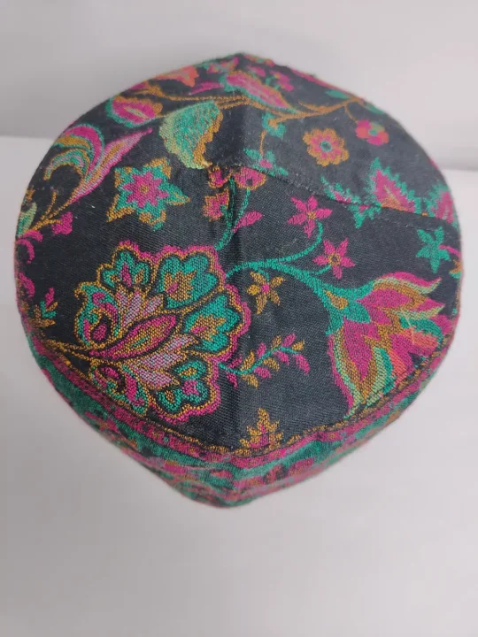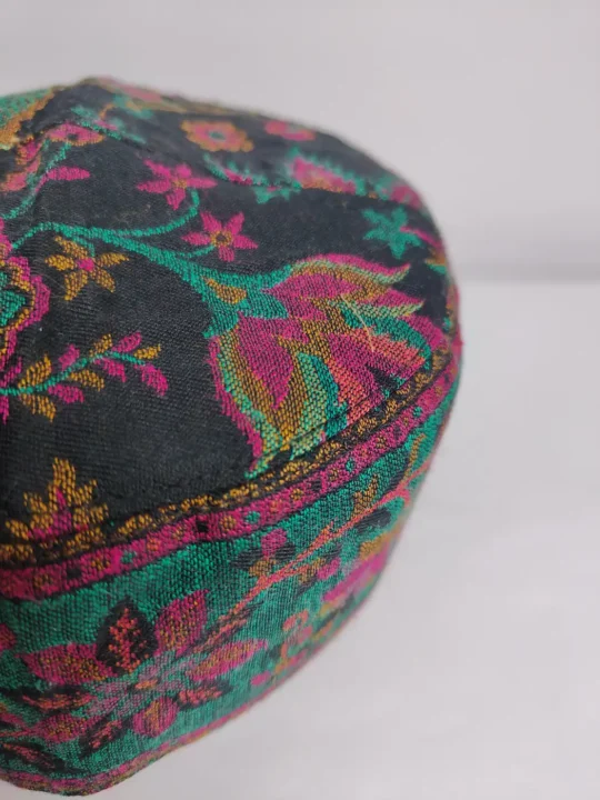Crafted from woven kani shawl fabric, this black unique Kashmiri kani cap reflects traditional Kashmiri textile artistry. Floral embroidery decorates the crown while continuous motifs gracefully flow along the sides. Top like this presents balanced detailing and heritage-inspired craftsmanship.