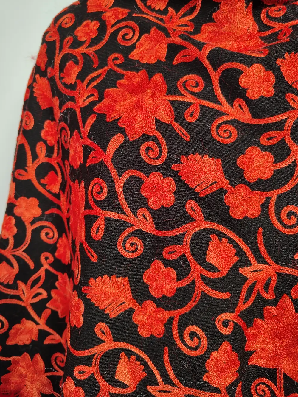 Fashioned for comfort and charm, this Cashmilon Poncho with red fur brings elegant Aari embroidery in soothing orange hues across the black body. The floral motifs enhance its gentle beauty (khoobsurti) in a subtle way. It comes with no lining, which allows easy wear and soft movement. With 43-inch width and 35-inch length, it’s the ideal women poncho without hood for winter layering.