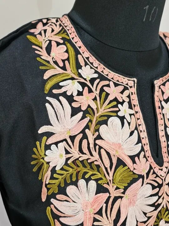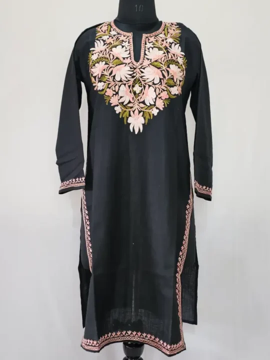 Crafted in Kashmir and stitched with softness in every thread, this black color long Ruby Cotton kurti is the kind of piece you’ll always keep reaching for. The fabric falls comfortably and lets its Aari embroidery stand out with subtle beauty. The design flows through neckline lotus inspired motifs with pinkish threads. It’s light, wearable, and gently traditional — whhich makes it perfect for calm days and small gatherings alike.