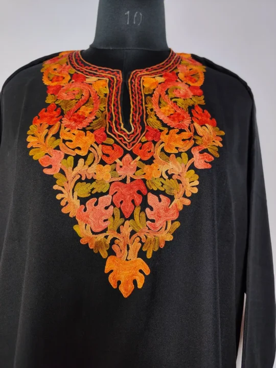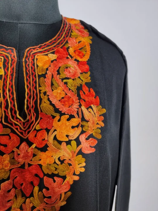 A soft black tone combined with floral aari embroidery at the neckline defines this Kashmiri long kurti. Made from summer cool cotton, it is the a piece that offers comfort, simplicity, and a gentle touch of tradition.