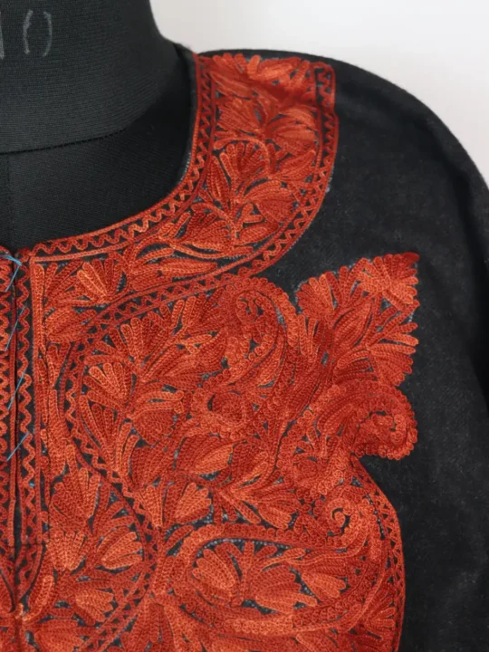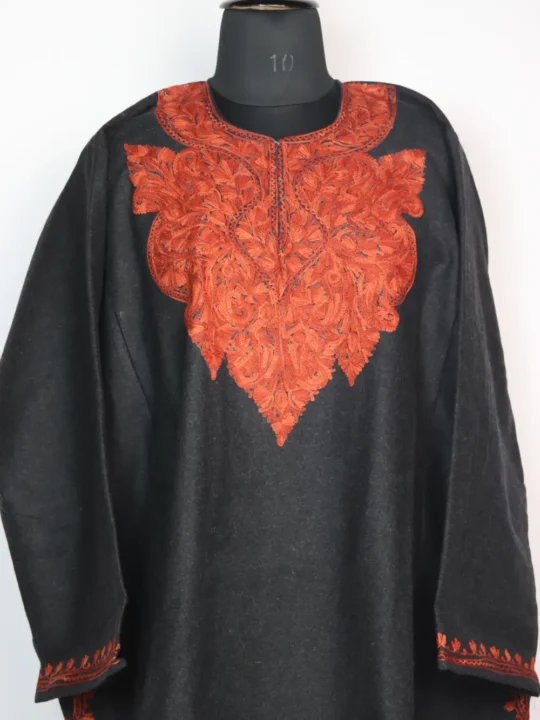A graceful tweed feran with badam and floral neckline aari work, giving it a classic and elegant look for winter.