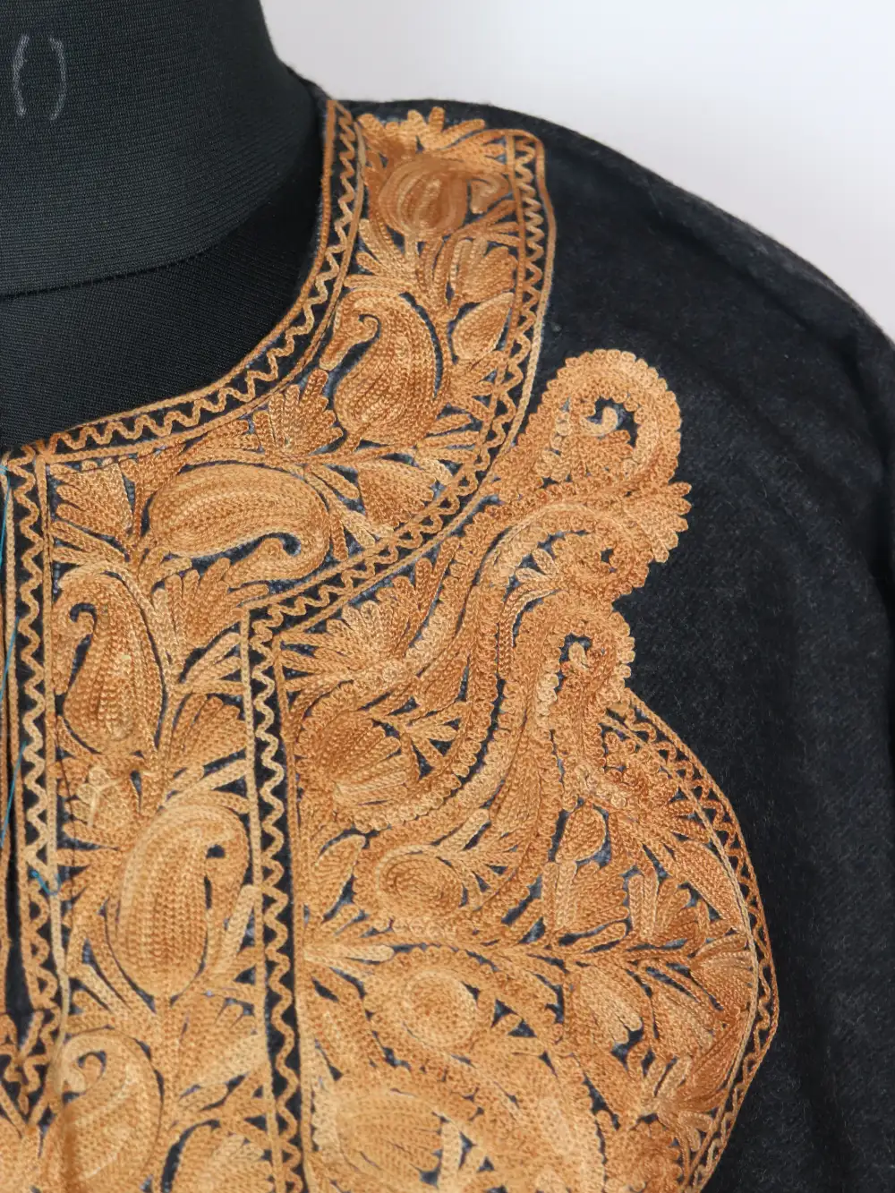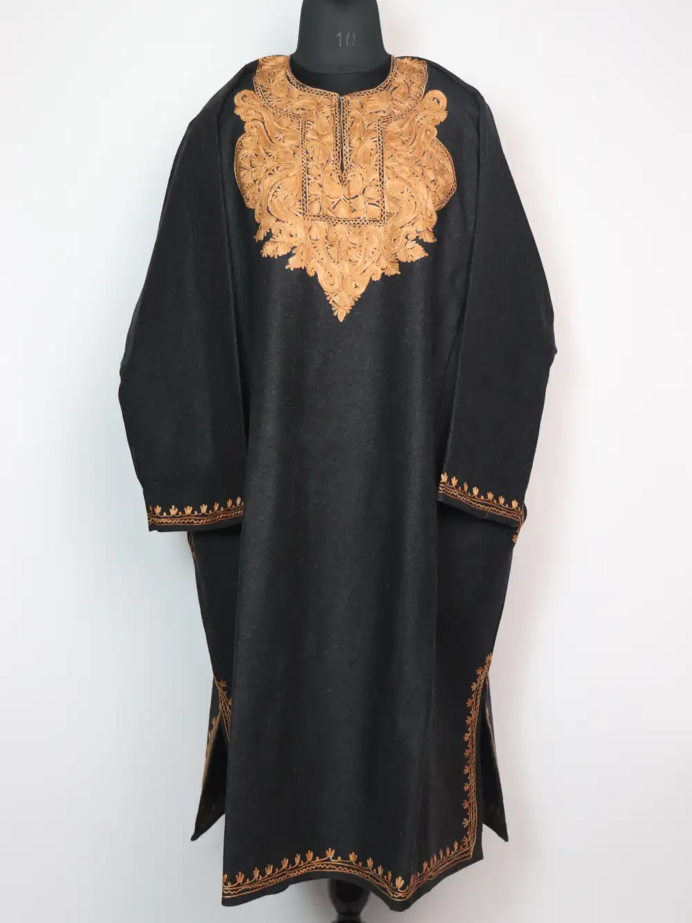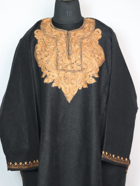 This beautiful black color with touch of grey shade in it, has detailed floral and badam aari kadhai around the neckline that blends smoothly with the tweed, giving the feran a graceful, classic look.