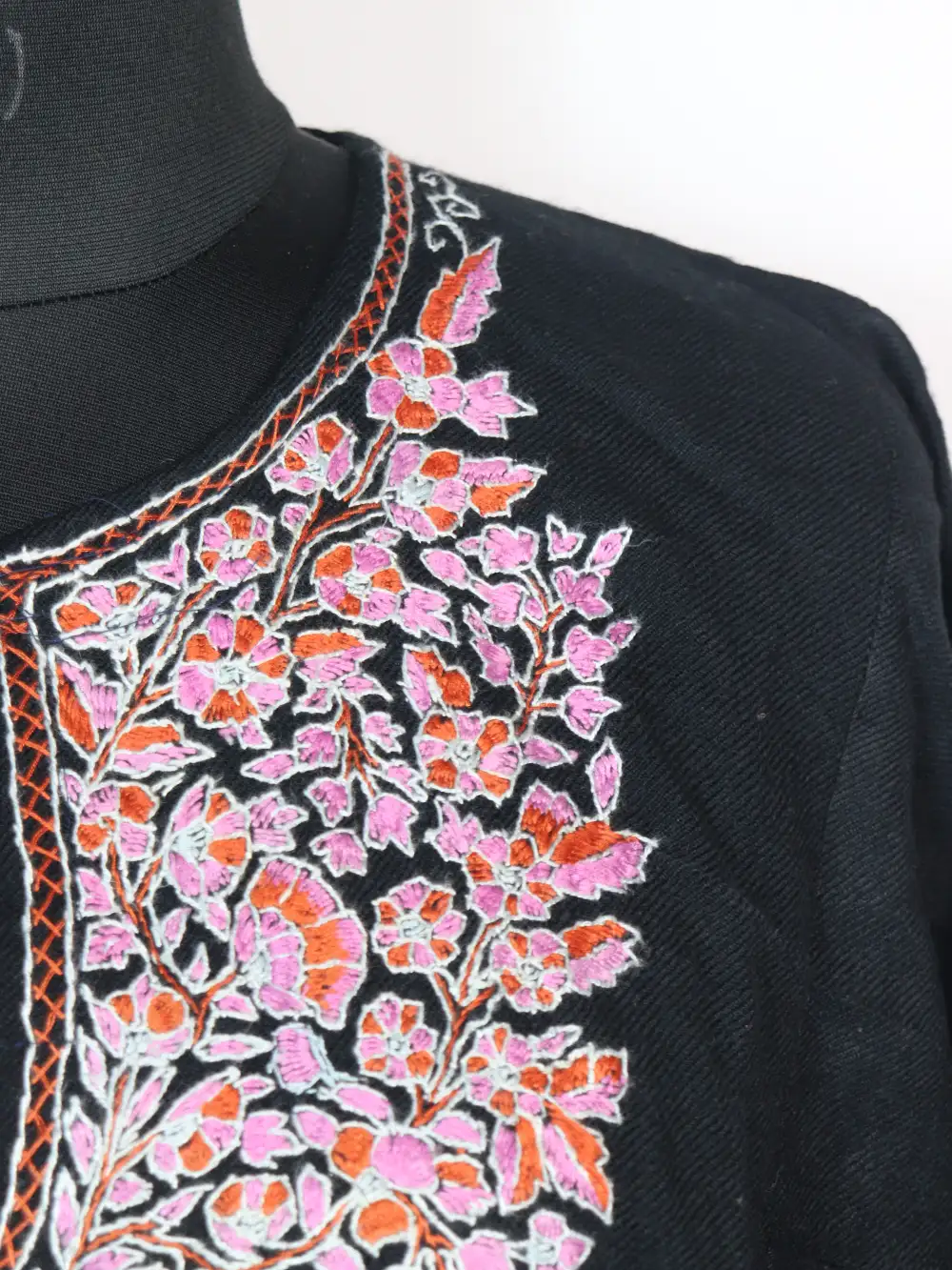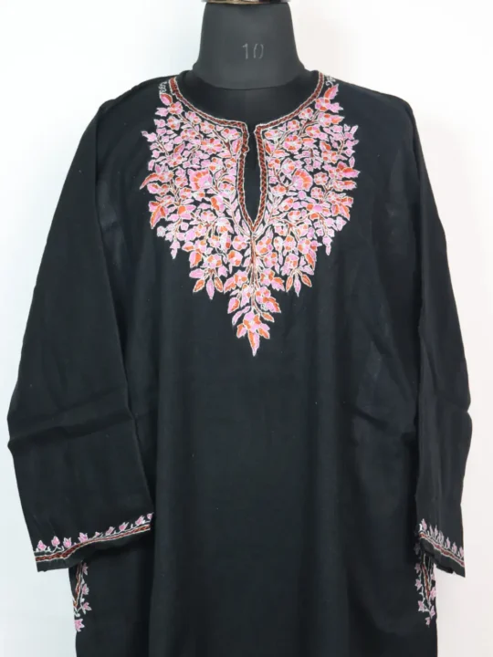 Soft raffal wool forms the base of this black kashmiri phiran, where paper machie and sozni embroidery enhances the neckline. With chest size 55 inches and length 44 inches, this kashmiri phiran lays softly on the frame and offers warmth.