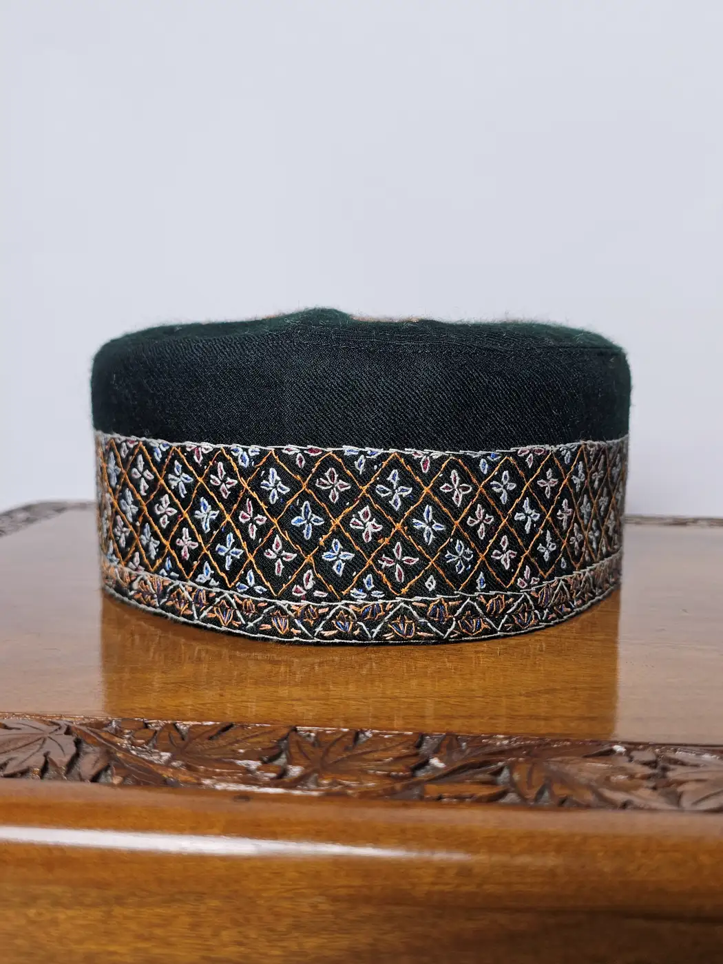 Handcrafted from pure pashmina, this black premium cap is enriched with delicate hand Sozni embroidery — one of Kashmir’s most treasured crafts. Its luxurious feel and detailed artistry which is done in floral motifs on top and geometrical patterns around the border in maroon, white, orange, blue and mustard threads, makes it a refined companion for weddings, gatherings, or spiritual occasions. It is a timeless symbol of Kashmiri pride, built with elegance and cultural depth.