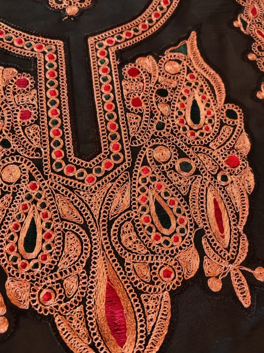 Styled in black colour using classic tilla work, this patch reflects Kashmiri craftsmanship. It adapts naturally to pheran hems, borders, sleeves and pockets. It flexible decorative options for personalized traditional styling.