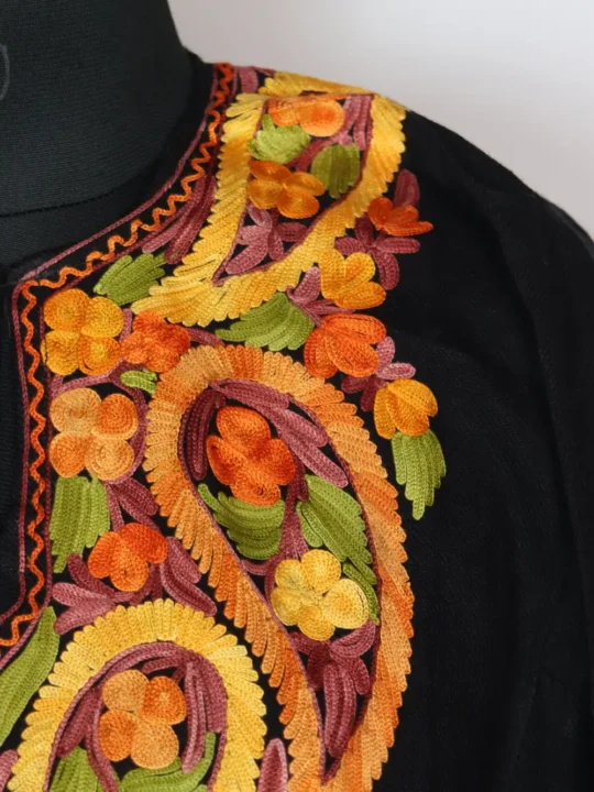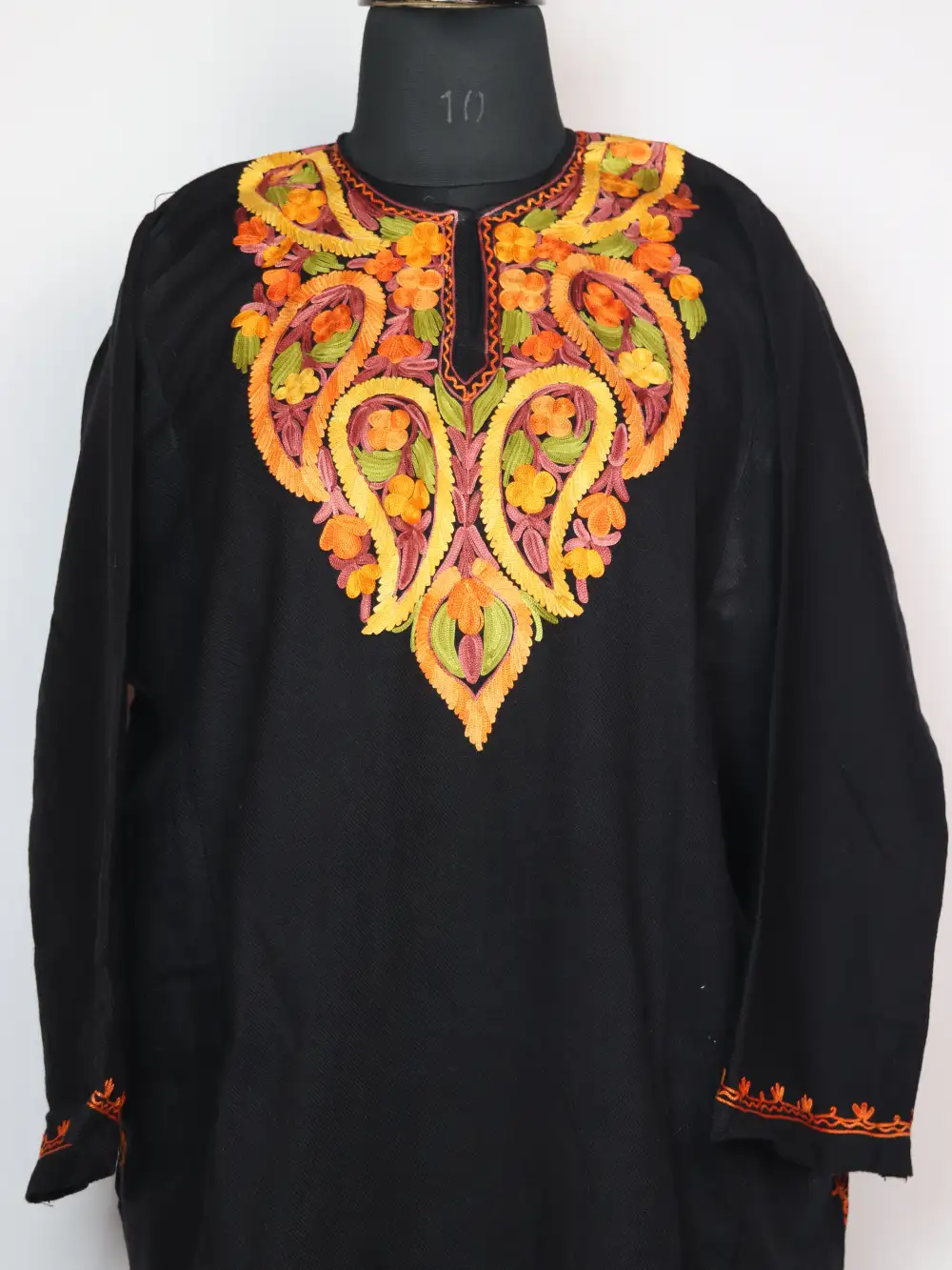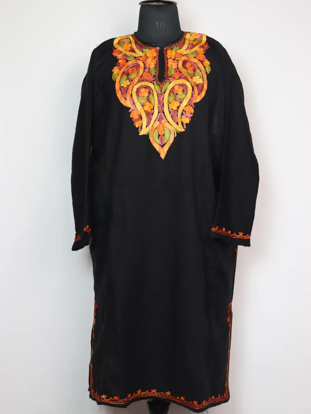 Kashmiri traditional dress crafted from warm Cashmilon wool features badam aari kadhai at neckline. It pockets on both sides add utility.