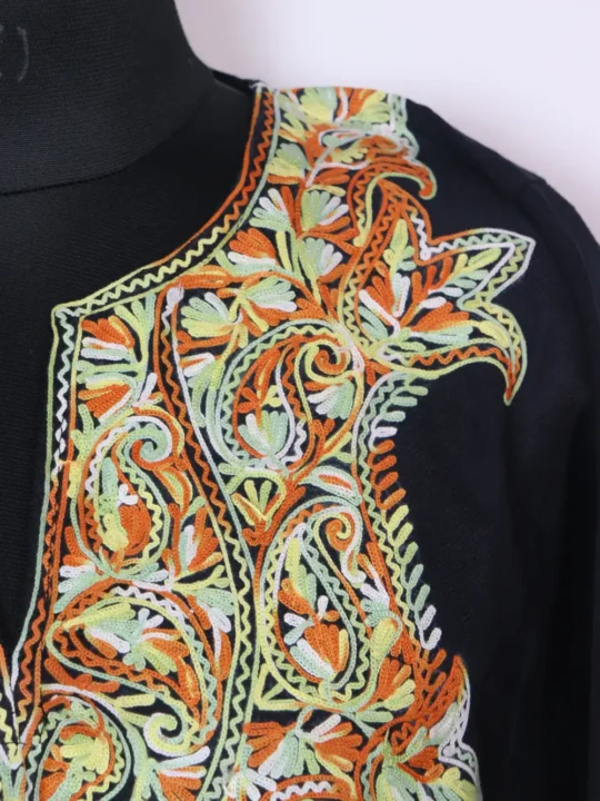 Prepared from cashmilon wool for cold climates, this phiran comes in black colour. Its floral aari embroidery decorates the neckline delicately.