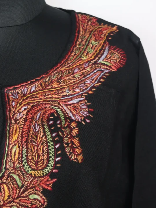 A Raffal wool feran with neat hand sozni floral kadhai with touch of badam patterns that keep the design elegant and graceful.