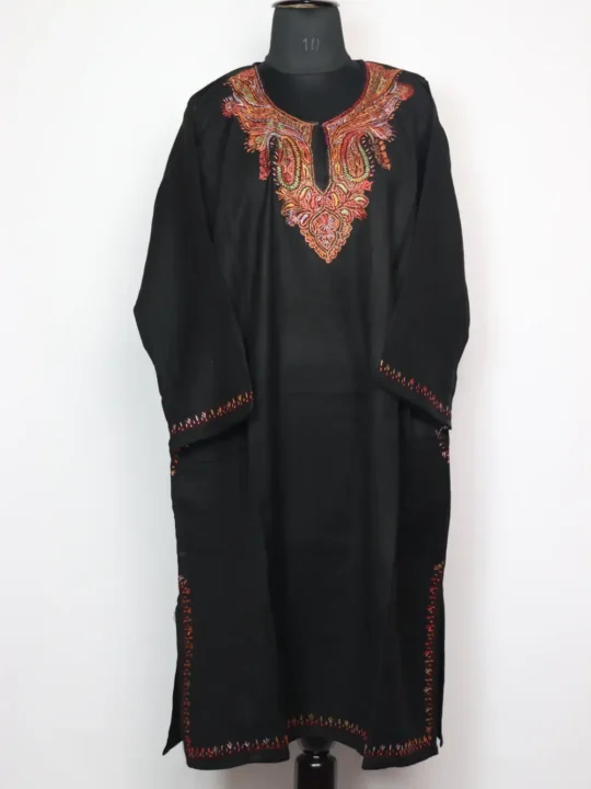 A Raffal wool feran with neat hand sozni floral kadhai with touch of badam patterns that keep the design elegant and graceful.