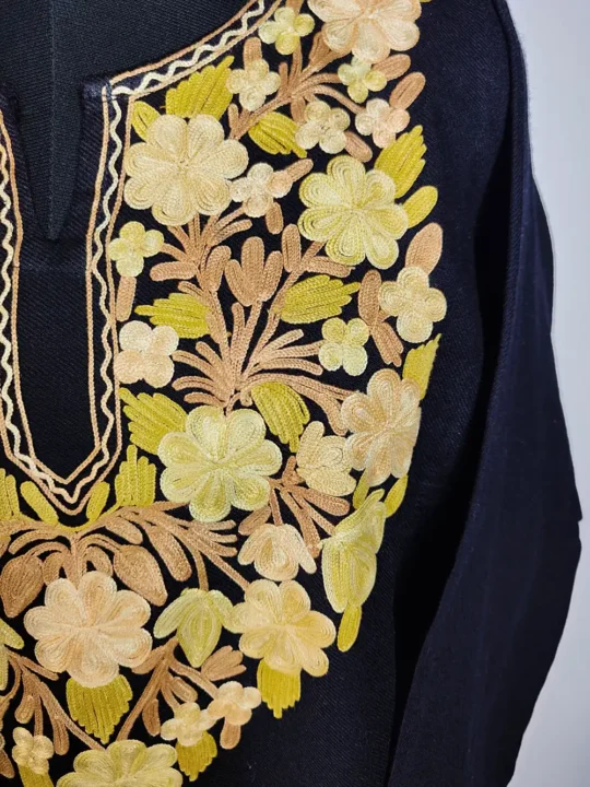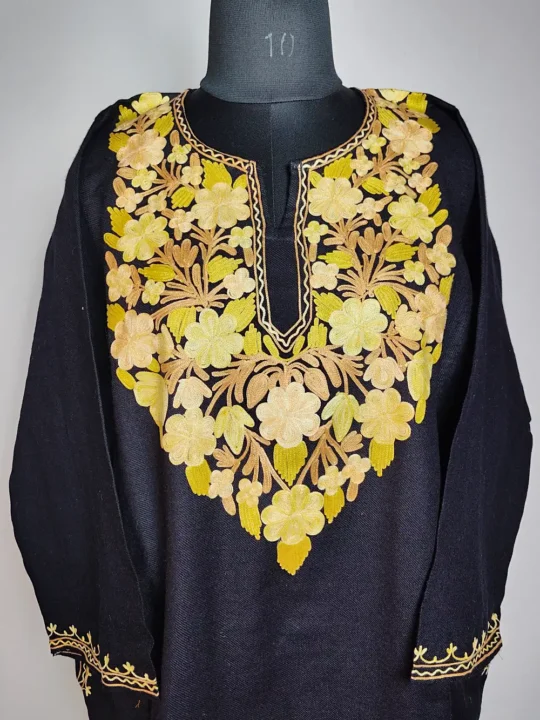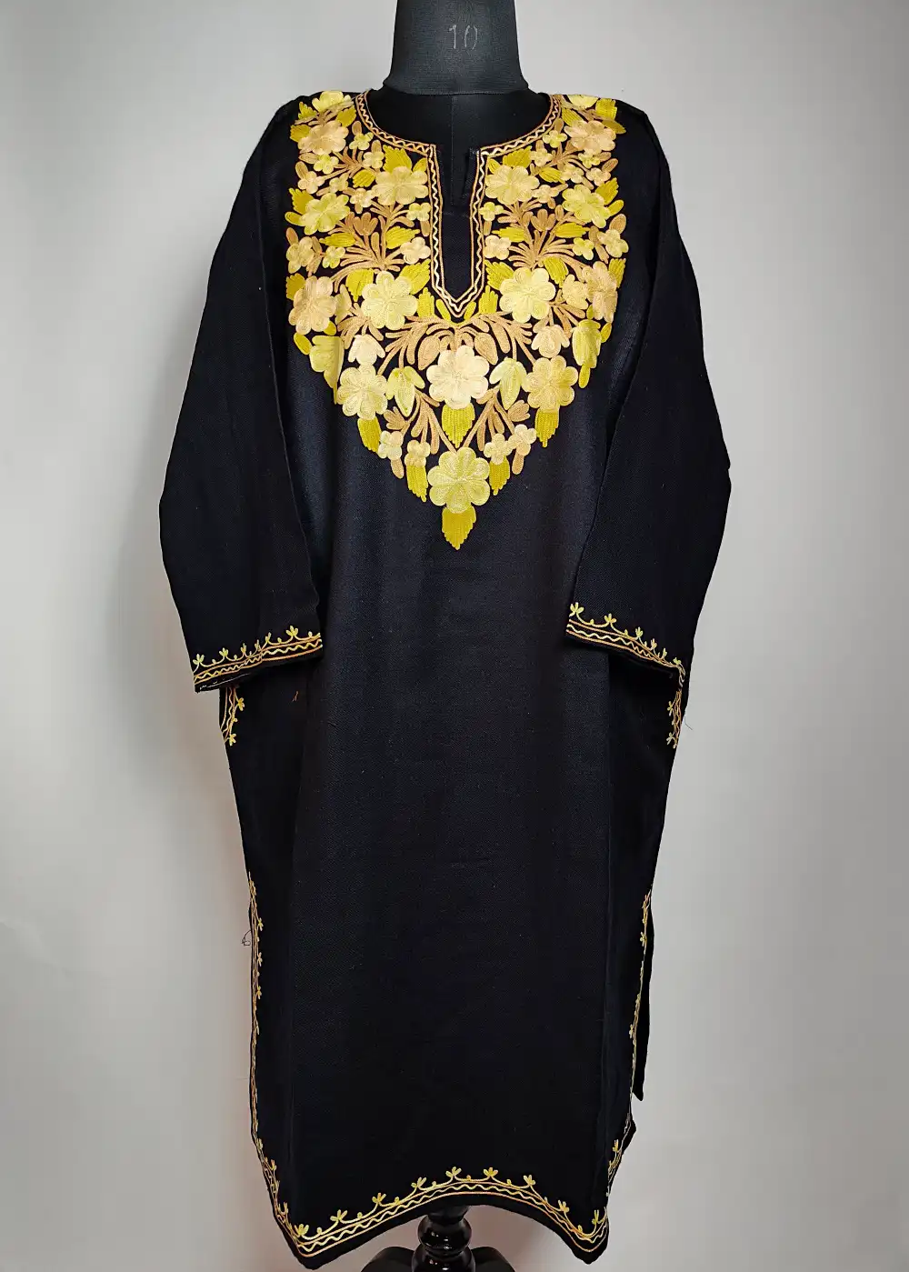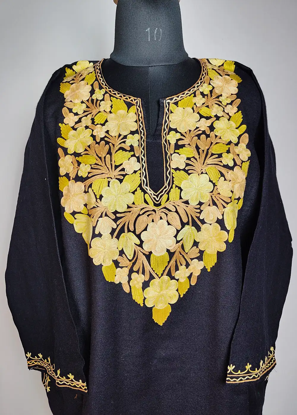 This pheran is made using warm cashmilon that keeps you warm and comfortable. The neckline is decorated with golden posh bagh Aari patterns that makes it the overall look complete. It blends easily with other winter layers.