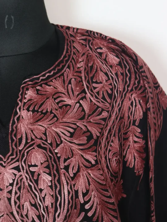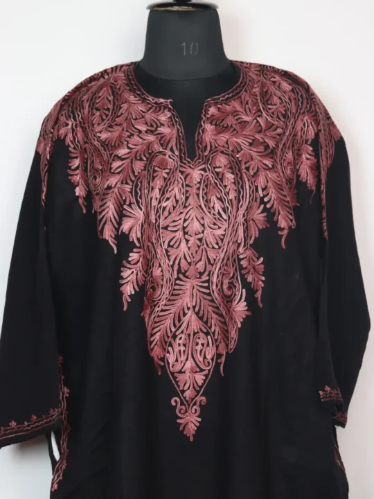 Prepared from cashmilon wool suited for cold weather, this stylish kashmiri feran appears in black colour. It includes aari embroidery with badam floral detailing on front back neckline and shoulders.