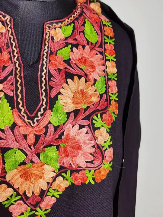 Soft cashmilon wool shapes this pheran and gives it a relaxed fall. The neckline is decorated with detailed posh bagh embroidery. Perfect for daily winter dressing. It comes in evergreen Black color.