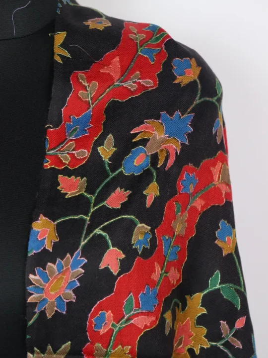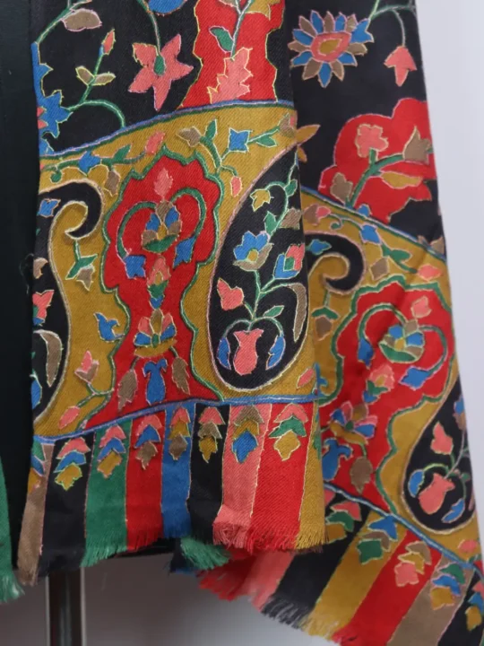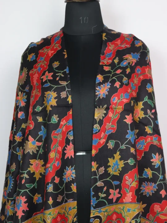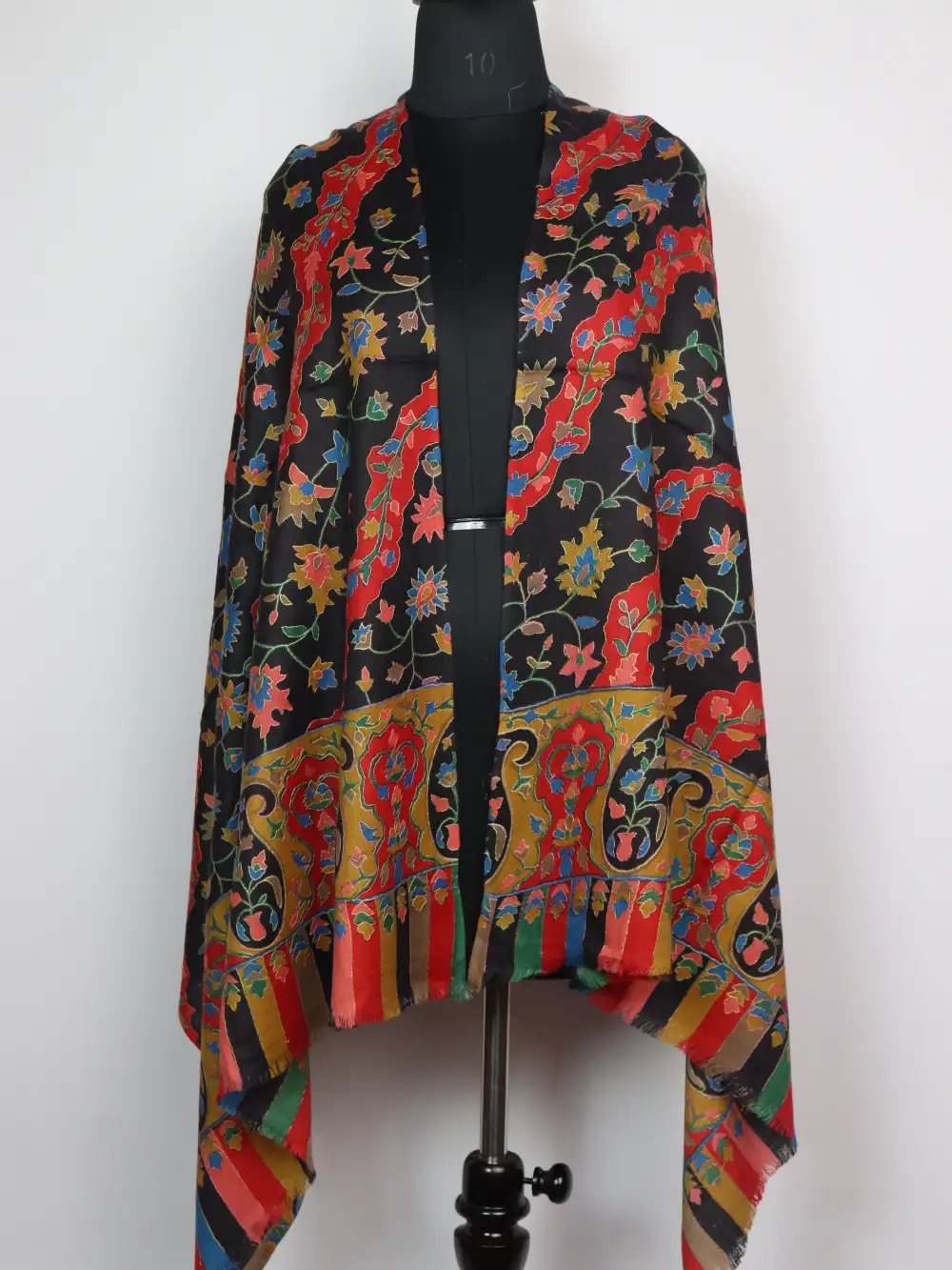 Black in colour this stole reads graceful and composed. It features kalamkari and sozni embroidery in continuous border and all over floral designs to create visual balance.