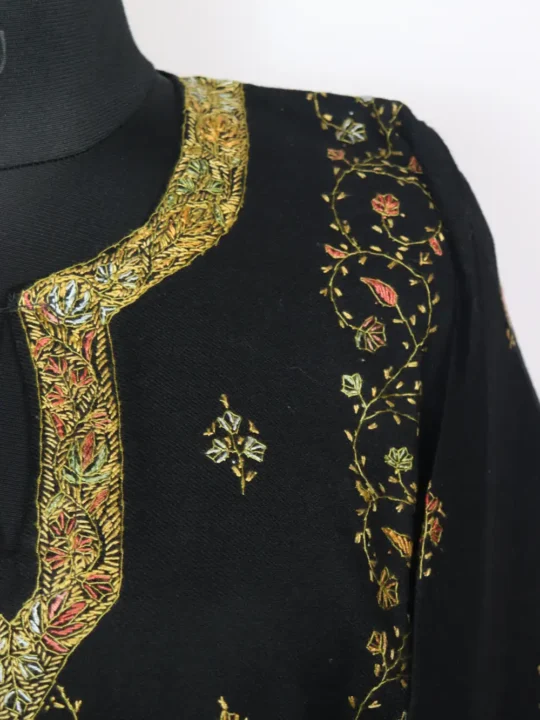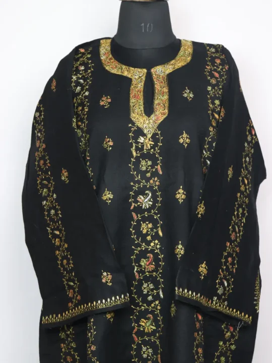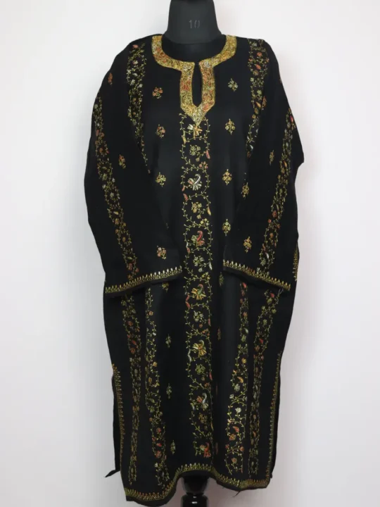 This raffal wool pheran is covered in hand Sozni work with bootis, giving it a rich Kashmiri look from top to bottom.