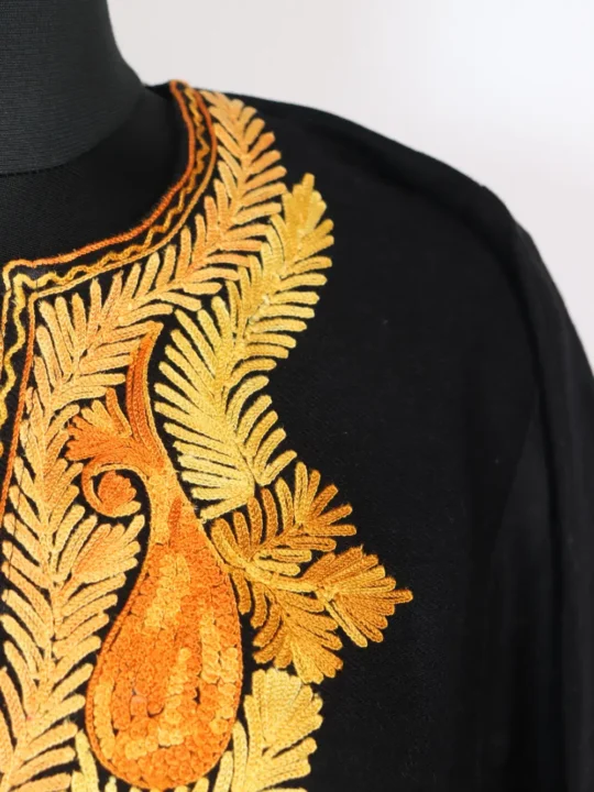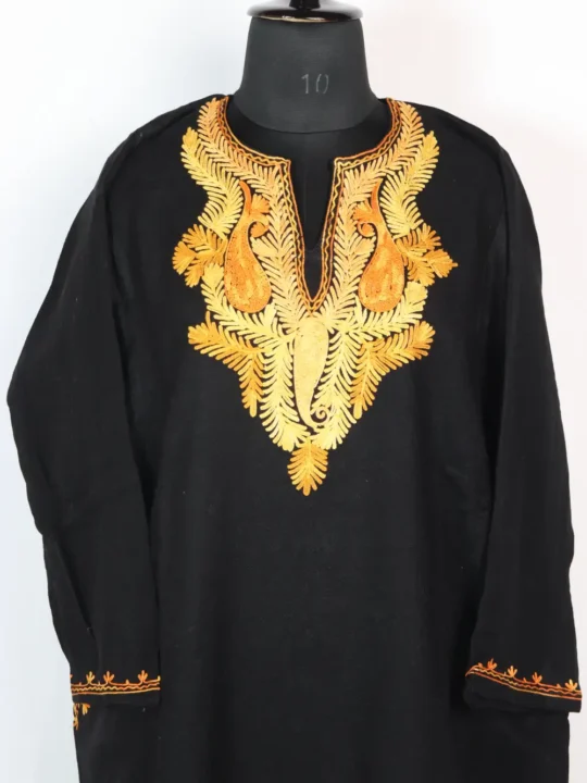 Neckline badam floral Aari work adds a delicate touch to this black Cashmilon wool Pheran, it layers neatly over warm garments. This Kashmiri feran keeps the rest of the surface plain so the neckline can stand out—check our phiran online options to buy this elegant neck-detail piece.