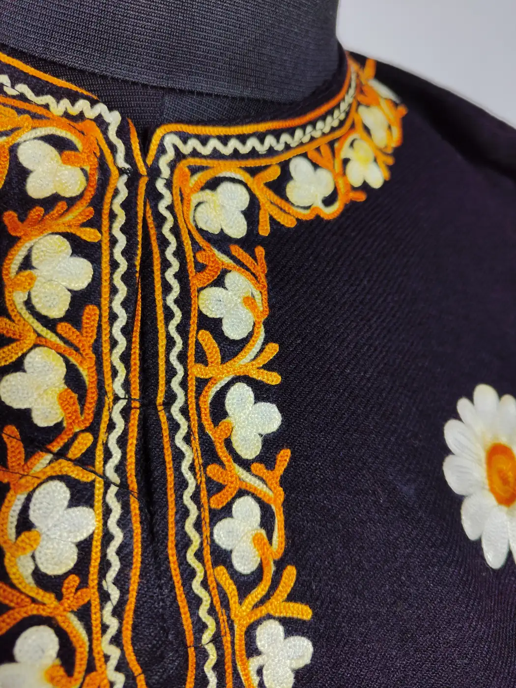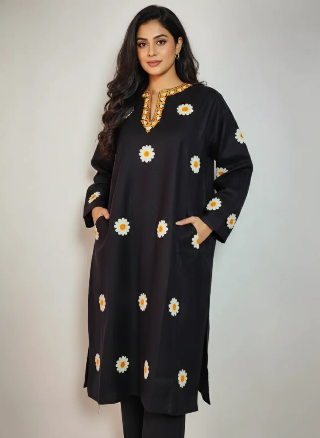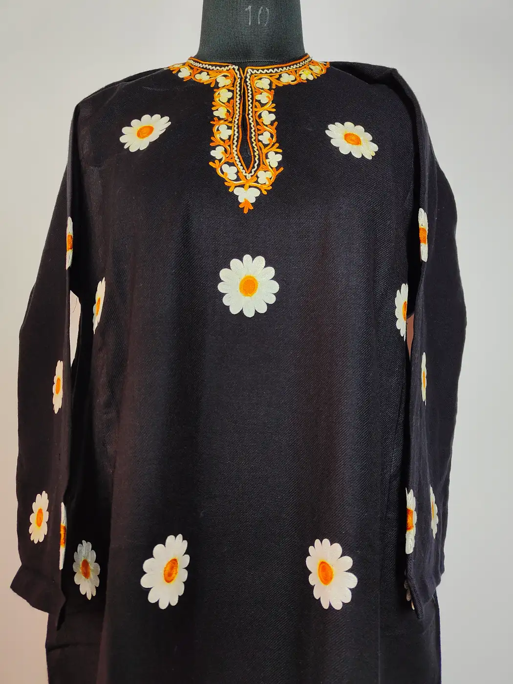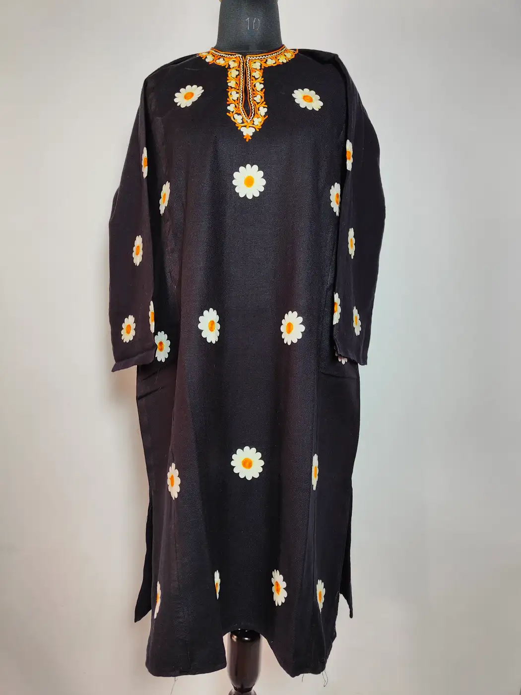 Crafted from black cashmilon wool, this Kashmiri faran carries Kashmiri warmth and cozy winter presence. It features aari embroidery that enriches the neckline and booti style on the panel.