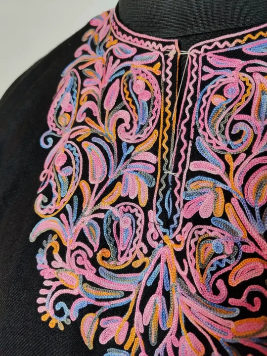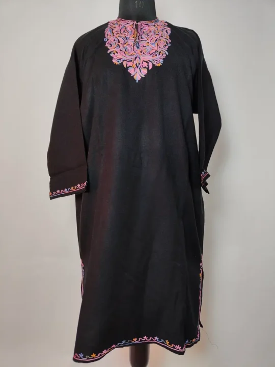 Warm and light, this black short pheran in Cashmilon wool fabric is elevated by pink, dark grey and mustard hue badam floral embroidery at the neckline. Its 40-inch size ensures comfort and coverage, which makes it ideal for winter layering. It is priced at ₹1299, it’s an accessible piece that blends simplicity with refined detailing, offering elegance for everyday moments.