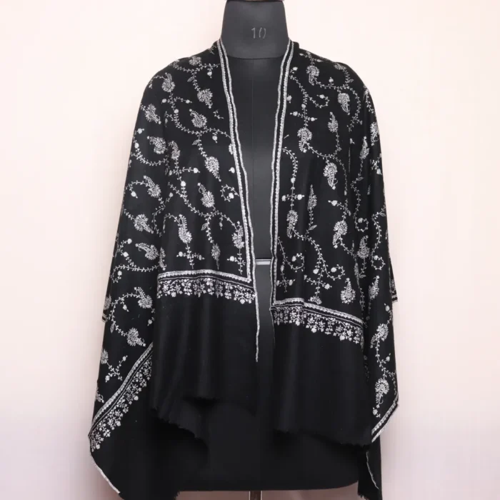 What sets this wrap apart is the intricate Sozni hand embroidery, delicately done with fine threads in traditional Kashmiri patterns. The embroidery adds an element of quiet sophistication to the minimalist black canvas, making it a versatile piece for both casual and formal occasions.