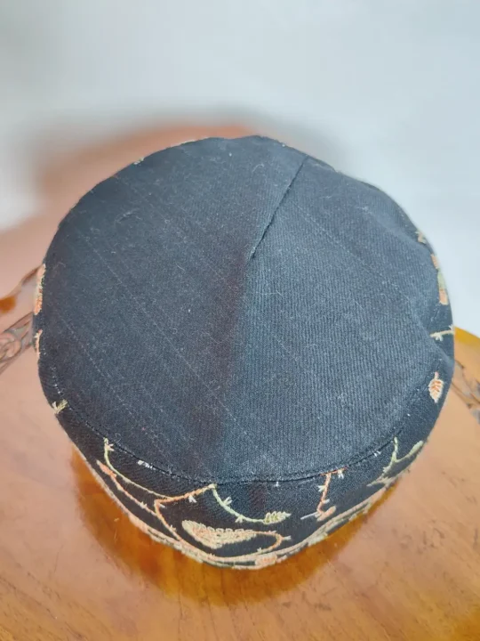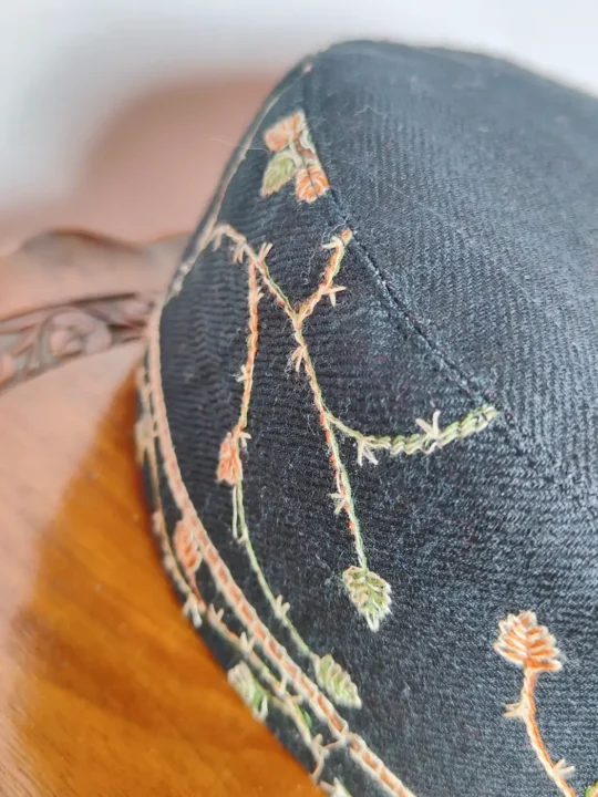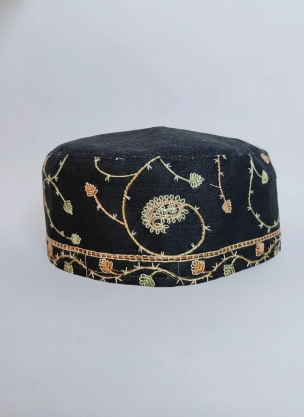 Finished in black fabric, this lightweight cap presents Kashmiri sozni embroidery, shaped carefully. lt offers soft feel and cozy comfort for all seasons – winter or summer.