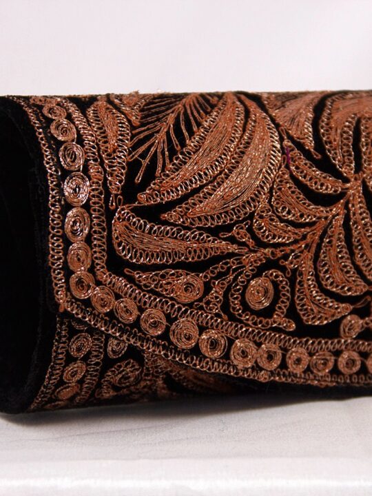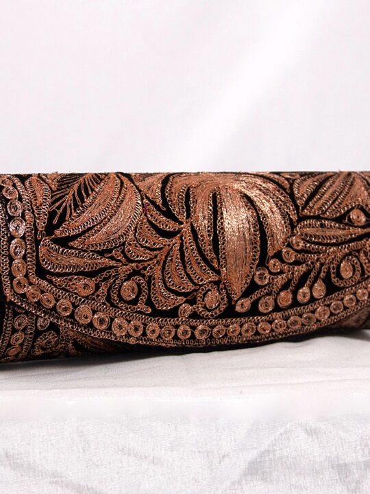 This makhmal clutch is black in color and has beautiful bronze tilla work on it. This will be perfect with your black pheran or black suit or black dress.