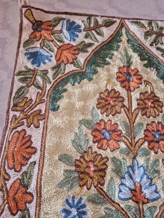 Designed in dusoot cotton for decorative walls, this wall hanging presents Kashmiri hand chain stitch embroidery crafted in silk threads. It has been crafted with a graceful vase filled with delicate blossoms, adorned with soft floral detailing that brings warmth to your walls. It adds a calm and elegant touch to your space. It is perfect for living rooms, bedrooms, or hallways, and perfect for homes that love classic floral décor.