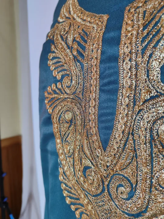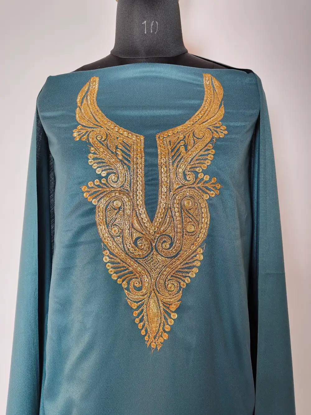 Acrowool salwar suit in blue hue presents Botte Tilla in badam motifs at the neckline. It comes as a 3pc set includes salwar kameez and dupatta. You will get his salwar kameez unstitched so that you can stitch to your measurements.