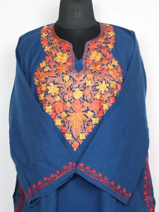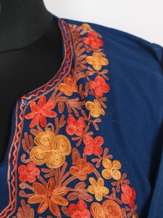 Presented in Cashmilon wool, this blue pheran is practical yet refined. It has pockets on both side for everyday ease. The neckline carries Aari embroidery in floral patterns to enhances the garment’s subtle Kashmiri charm.