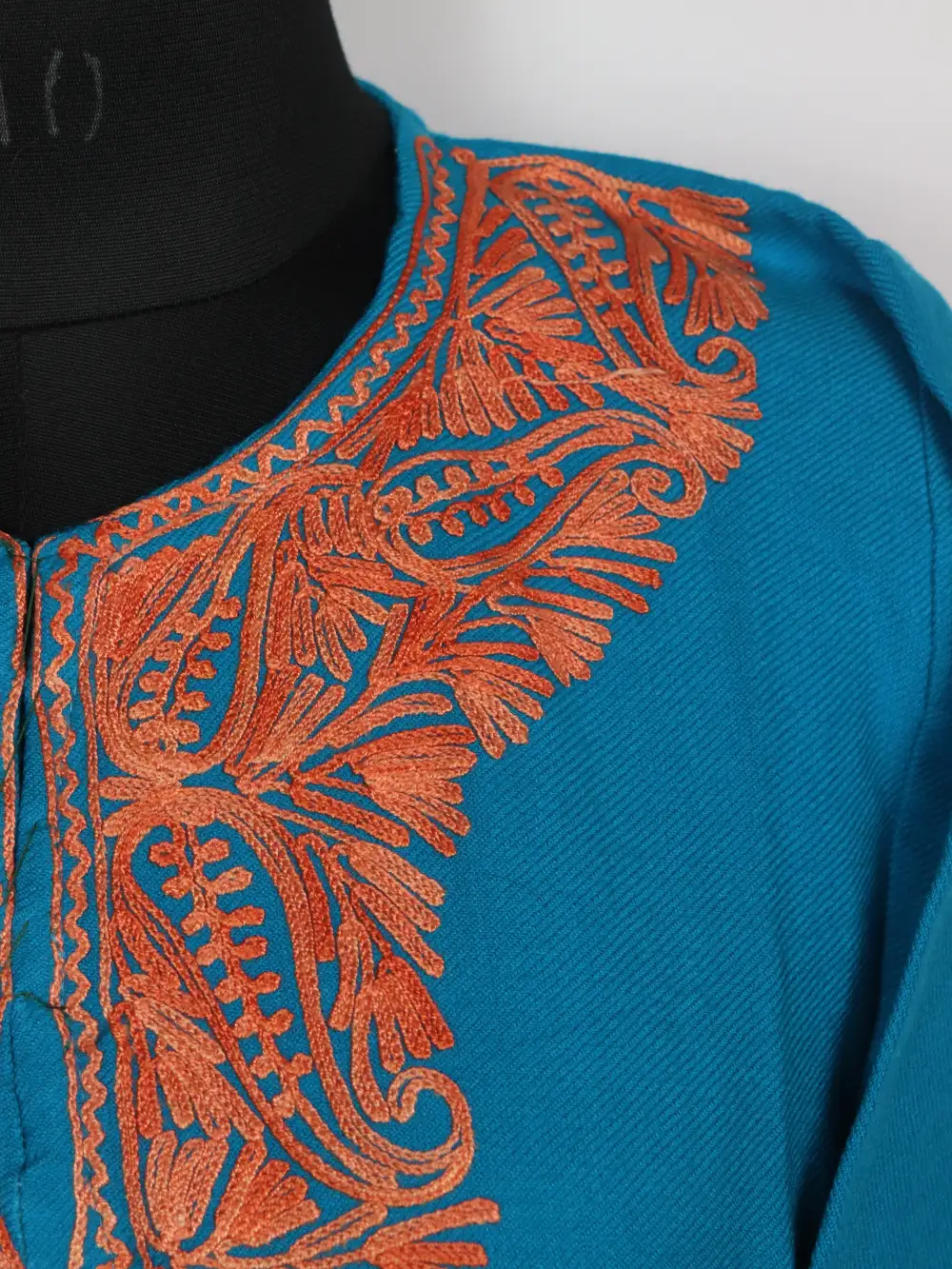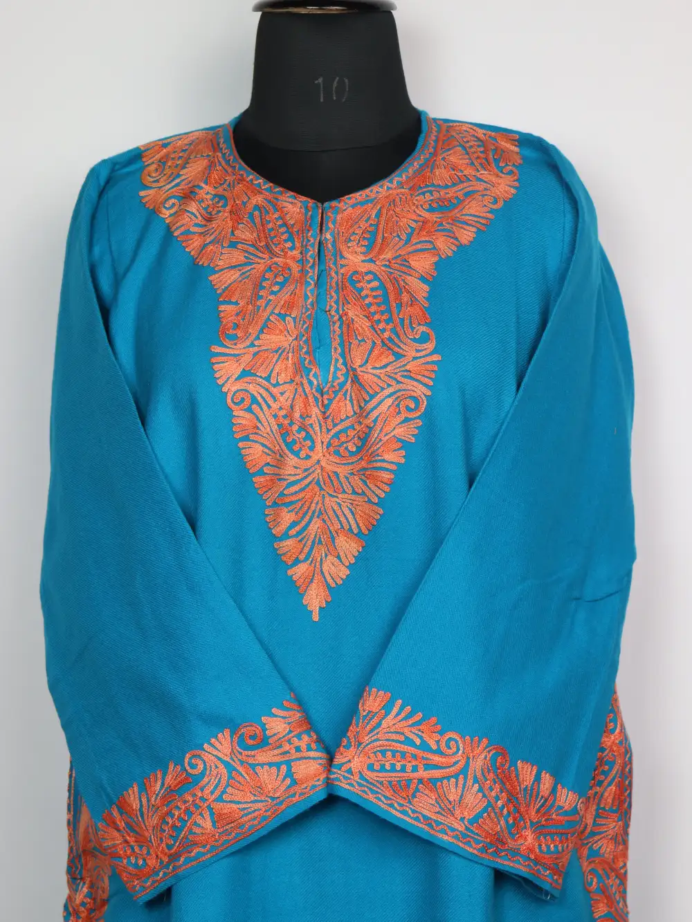Cashmilon wool crafted blue phiran dress displays Aari embroidery at the neckline, sleeves and border stitched into layered flower motifs which enrich this blue fabric’s look. Its chest size 49 inches and length 43 yield a flowing fall and comfortable movement.