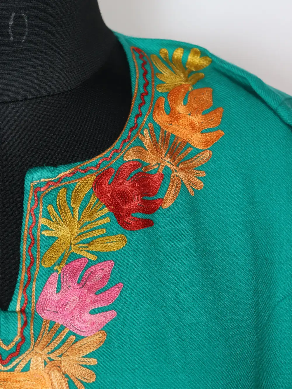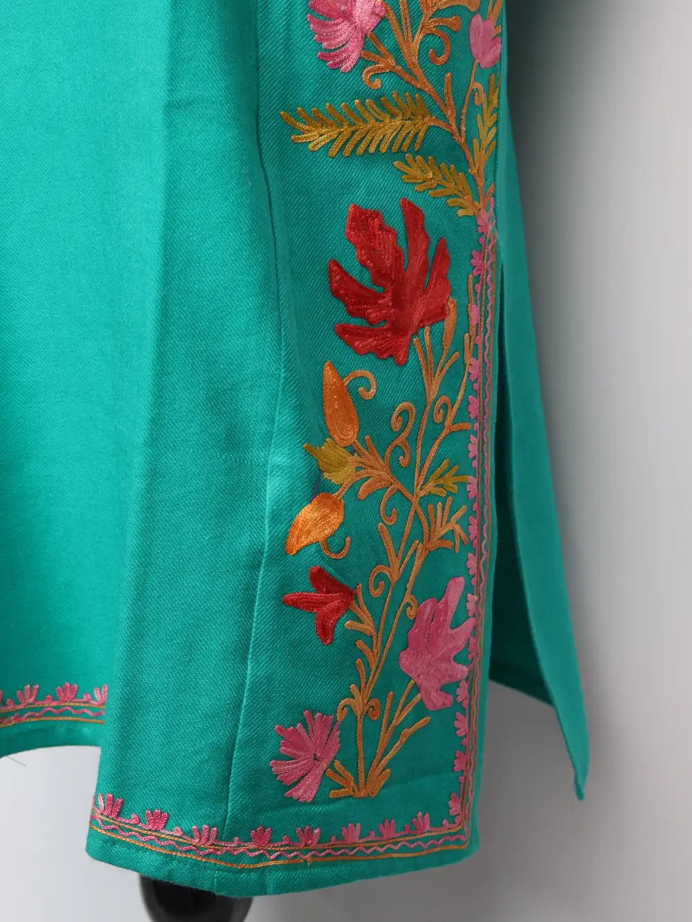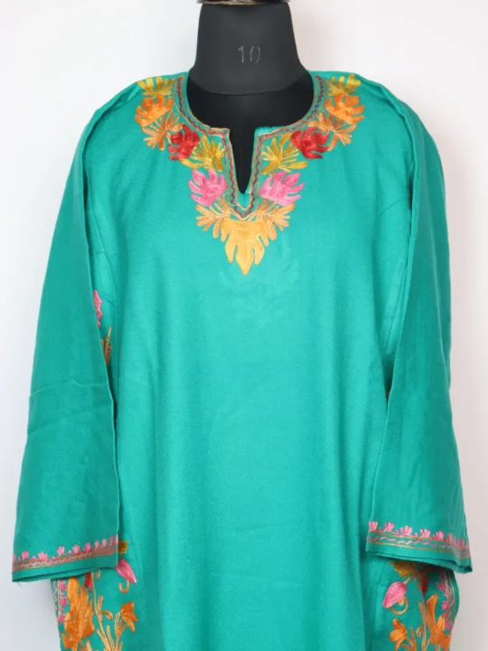 Kashmiri sea green woolen phiran cut from Cashmilon wool features Chinari embroidery at neckline and side panels. It includes chest size 54 and length 44 that guarantee a roomy drape.