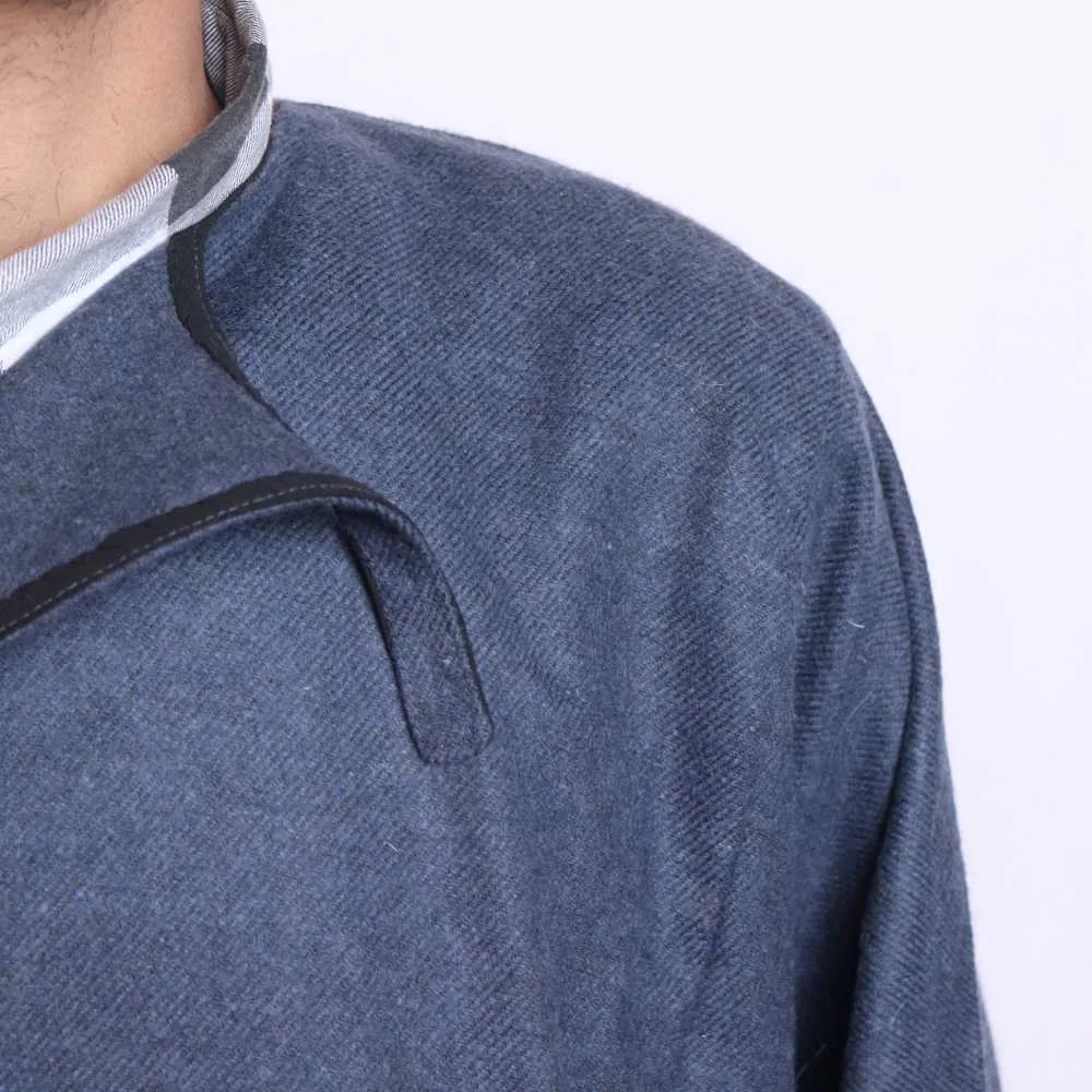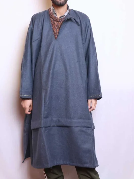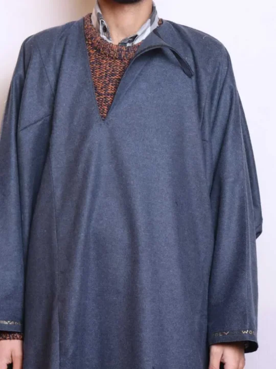 This is a classic old style pheran for men. It’s rarely available now. The neck has a unique Kashmiri style and there’s also the traditional extra stitching at the bottom.