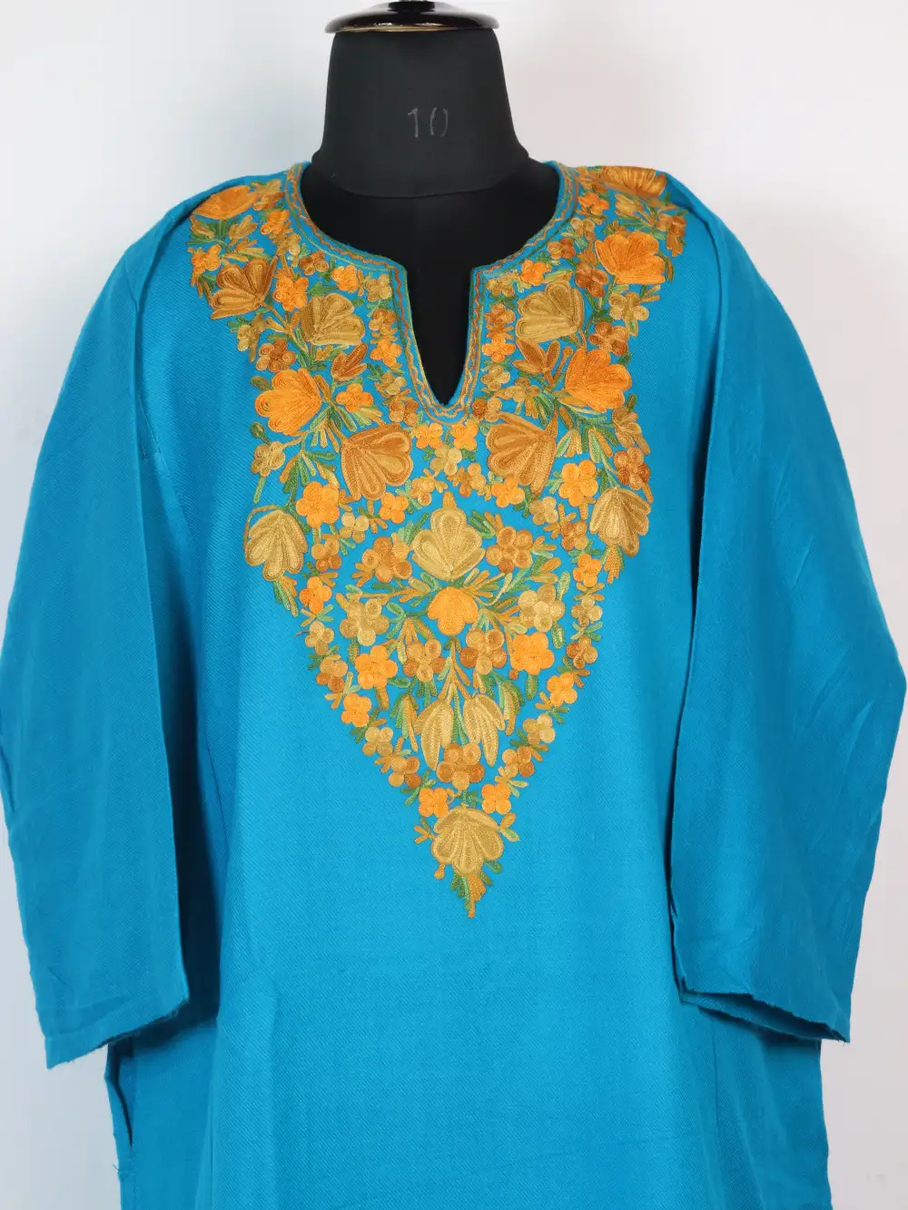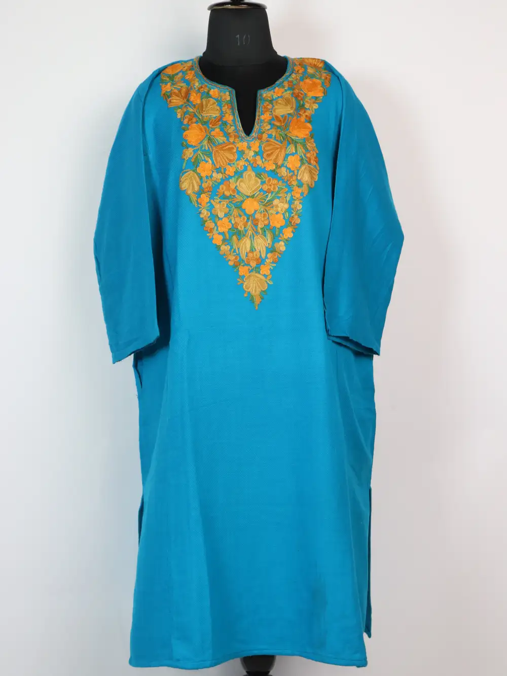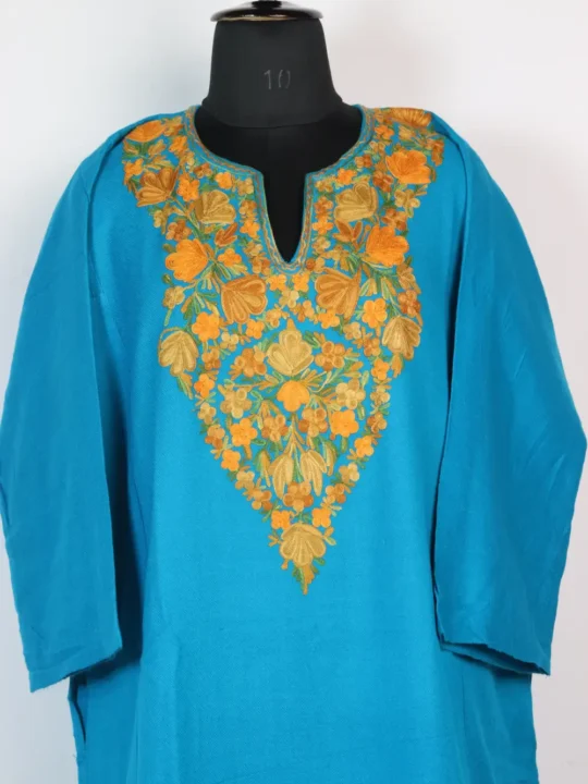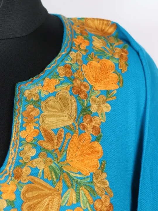 Warm blue Cashmilon wool makes the Hina pheran perfect for winter layering. Aari embroidery in mustard florals and green leaves patterns along the neckline enhances its classic traditional appeal. With 43.5-inch length and 50-inch chest, the pheran drapes lightly while offering comfort. It is practical for home or casual use, this pheran is ideal for buyers who are looking for Kashmiri phiran female, blending warmth, style, and everyday usability.
