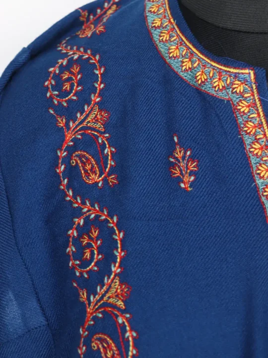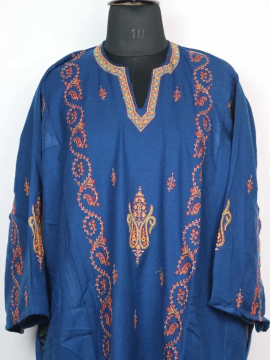 Made in cashmilon wool this Jashn-e-Rekhta stylish Kashmiri pheran shows Sozni embroidery in continuous lakeer and booti style work all over the front panel and neckline.