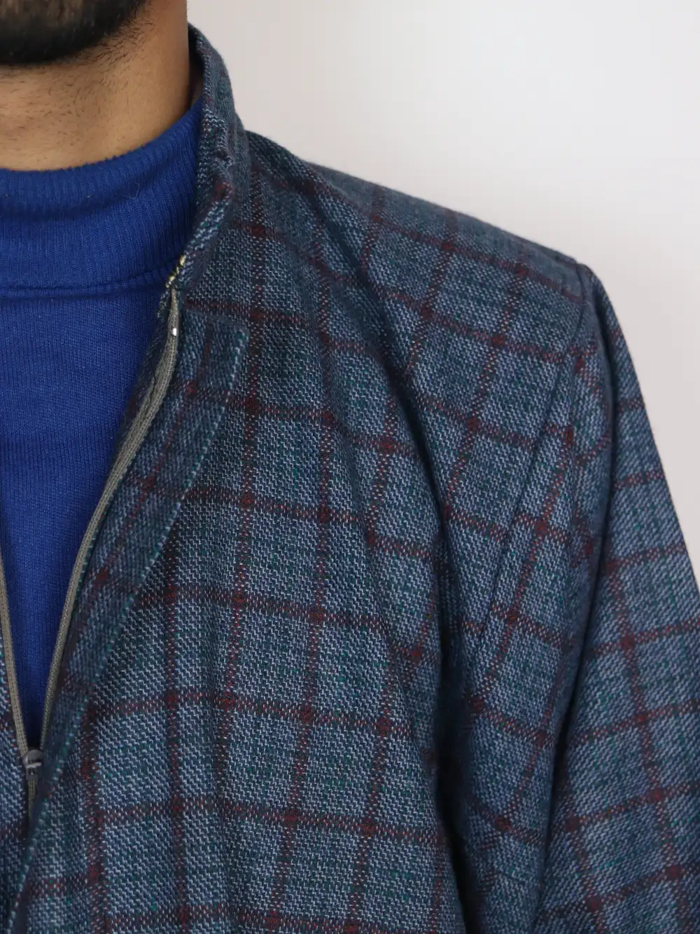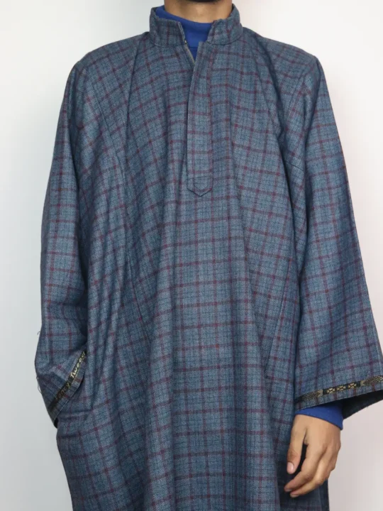 Stylish Kashmiri feran in blue hue is tailored in durable check tweed, giving you a classic winter feel. It carries Kashmiri comfort naturally, and one side pockets add easy usefulness for daily wear during chilly days.