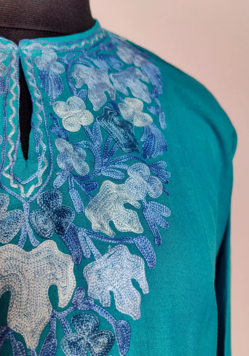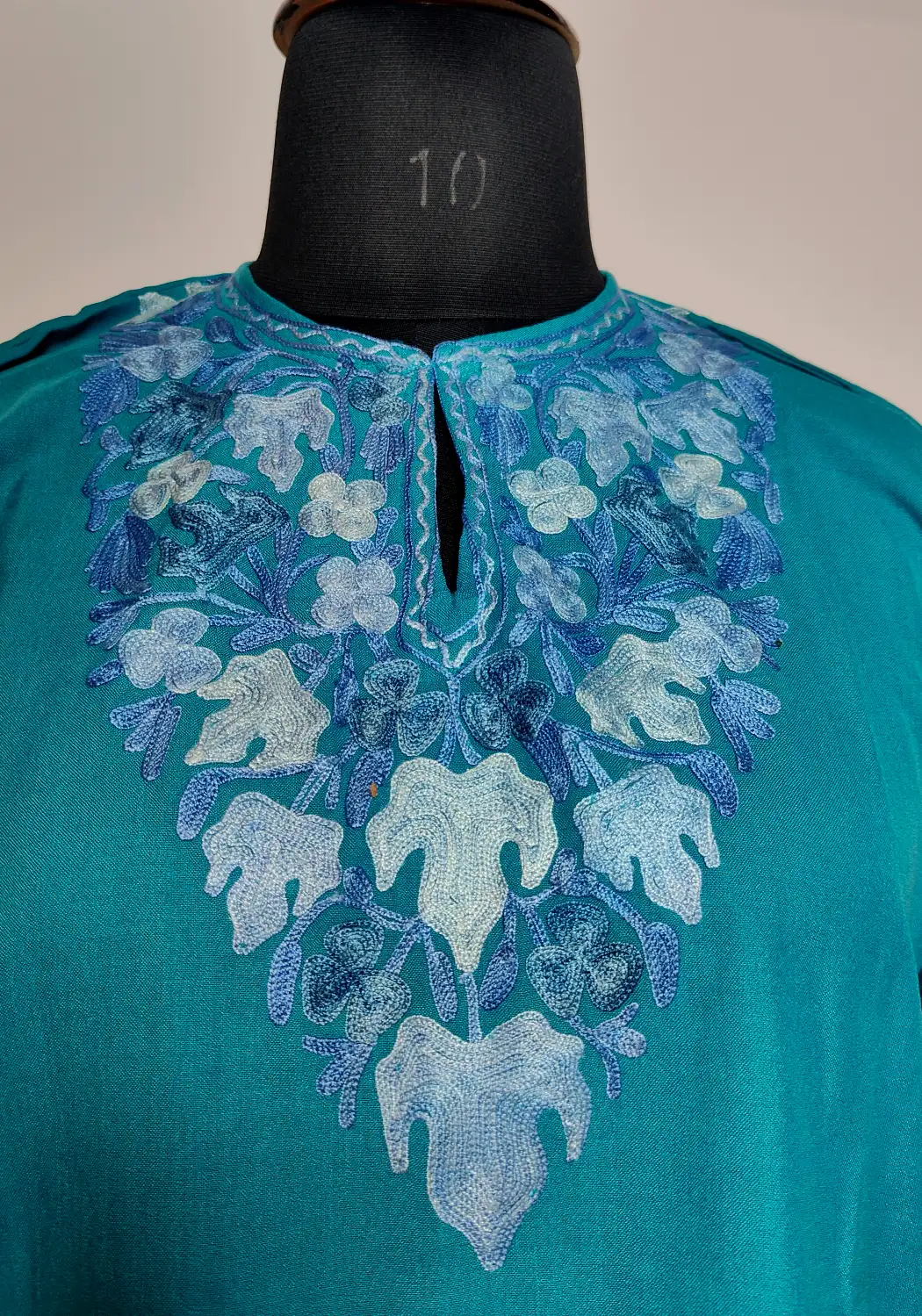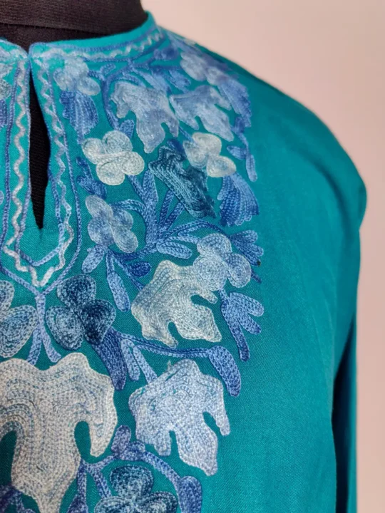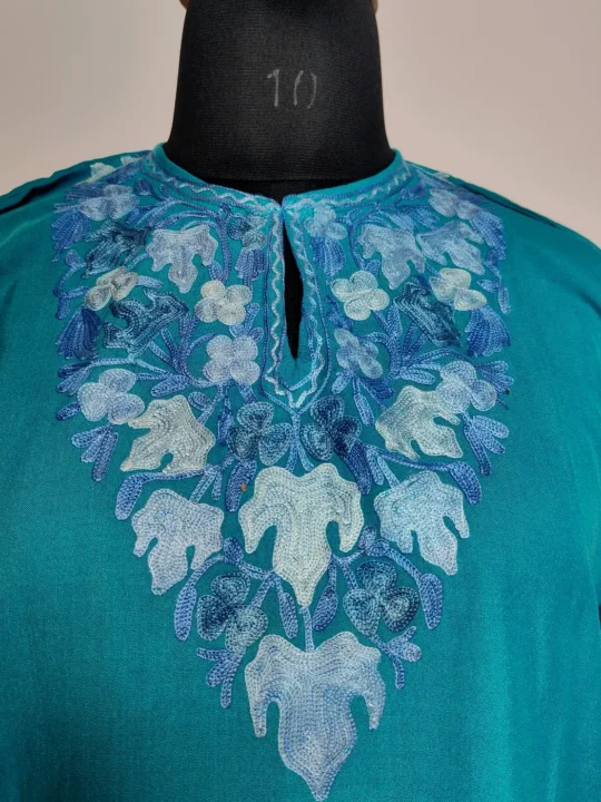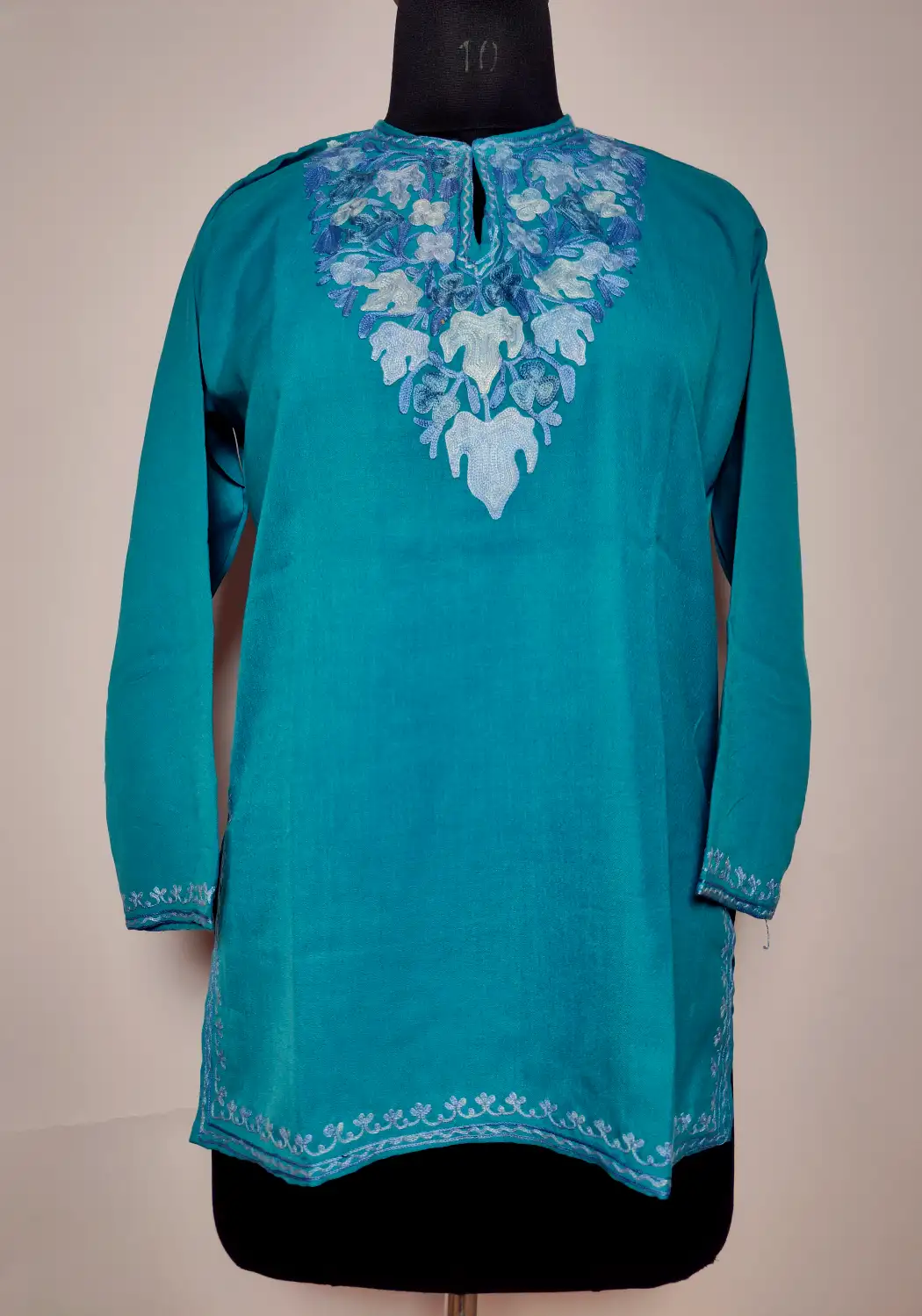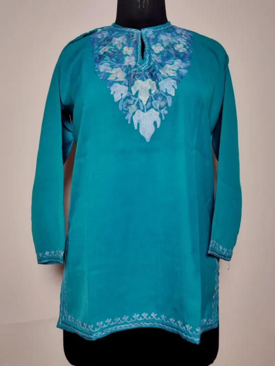 A soft floral touch at the neckline defines this aari work short kurti’s design, set against blue summer cool cotton. The fabric feels breathable and smooth, which makes it ideal for regular wear. It carries a neat balance of simplicity and Kashmiri craftsmanship.