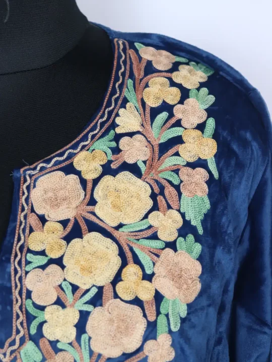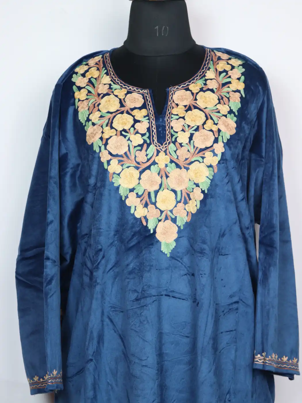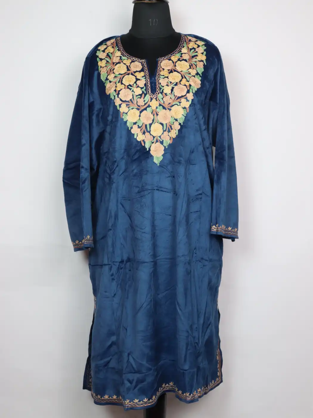 This beautiful blue feran carries velvet that feels soft like moonlight. Aari flowers kadhai around the neckline, and the 60 chest with 44 length gives a free, flowing shape with two side pockets. It looks graceful and keeps you comfortable through the day. A reliable winter piece.