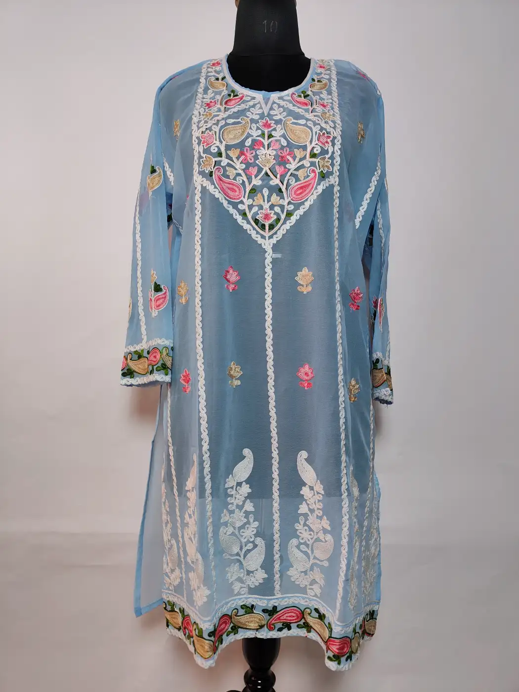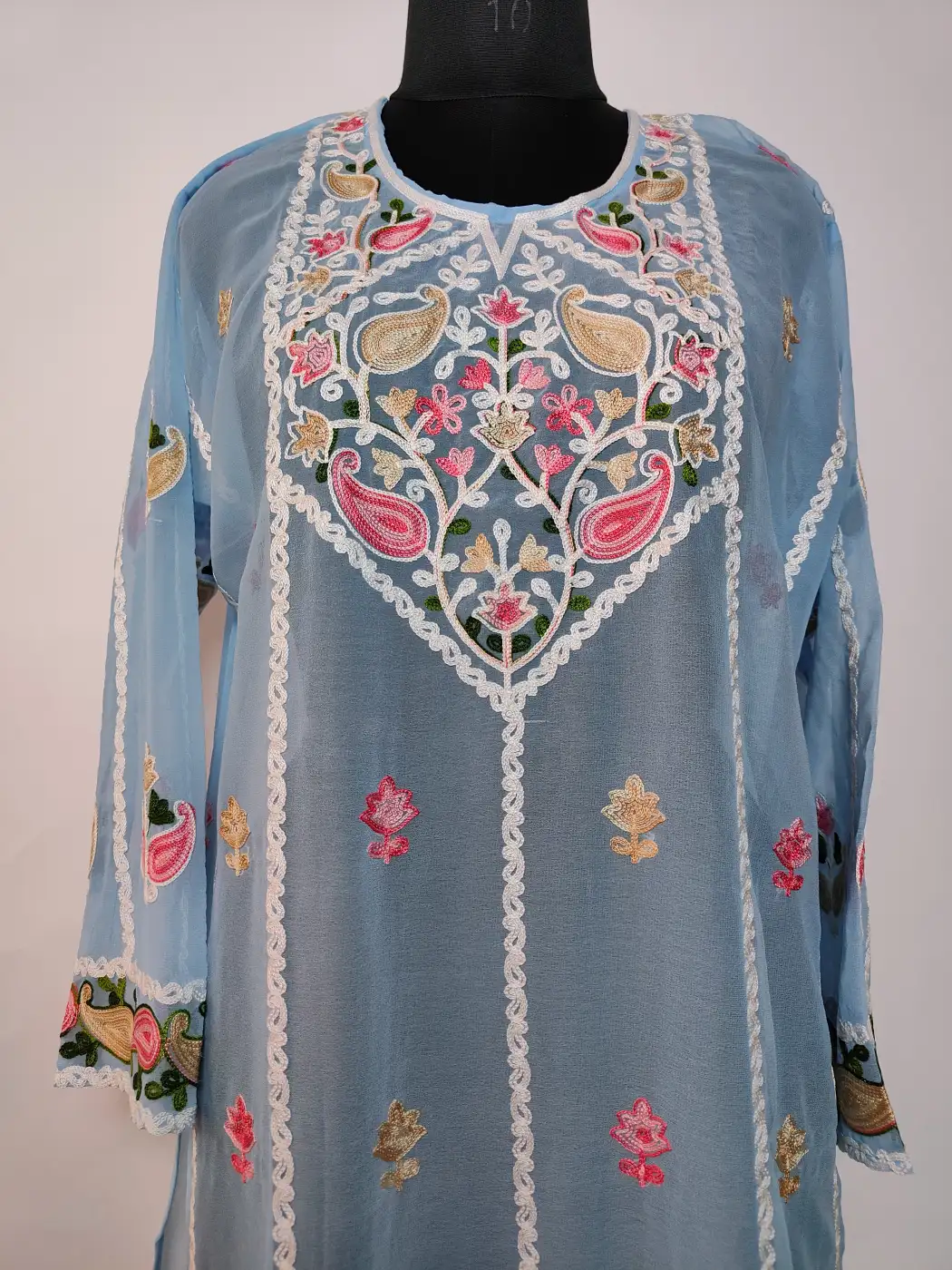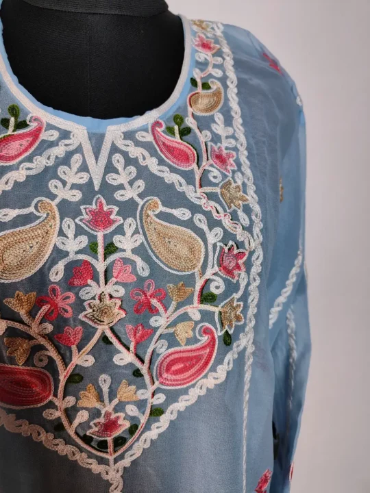 This blue colour georgette kurti reflects Kashmiri artistry through refined aari embroidery. A beautifully filled neckline panel carries floral and paisley patterns, which forms the highlight of the design. Slim embroidered strips fall vertically across the front with scattered bootis which adds amazing detail. At the lower section, elegant vertical motifs which bloom above a decorative paisley hem border.