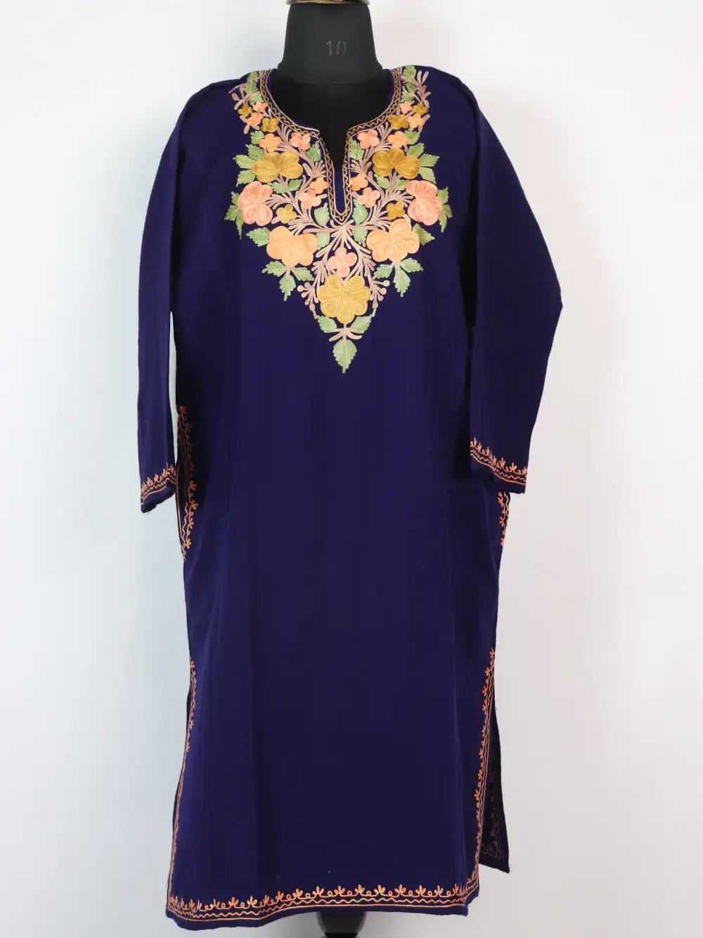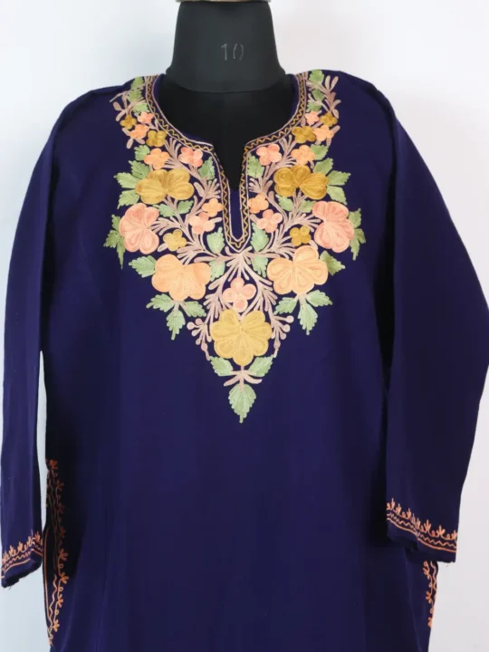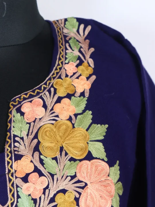 Warm and stylish, the naaz pheran in royal blue Cashmilon wool features green and pink shaded floral with green leaves designs Aari embroidery at the neckline enhances its traditional appeal. Measuring 44 inches in length with a 49-inch chest, this pheran drapes elegantly for winter layering. It has been designed for casual or semi-formal use, this pheran is perfect for those who are searching for pheran online. It balances soft warmth with everyday practicality.
